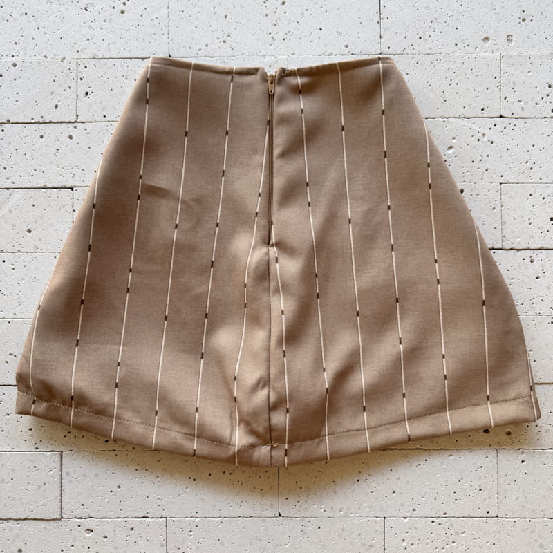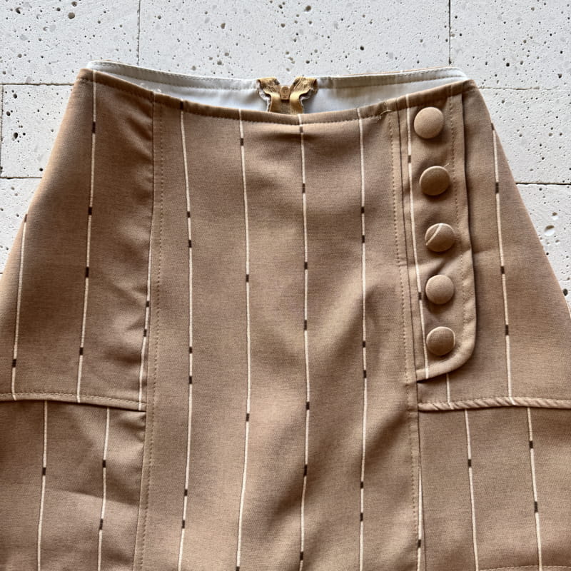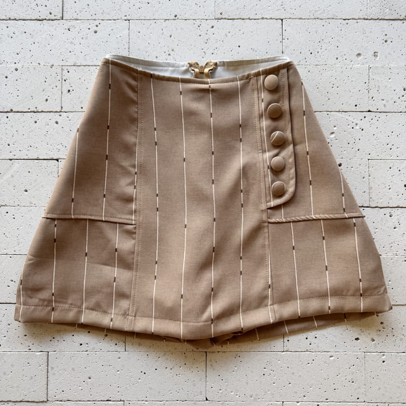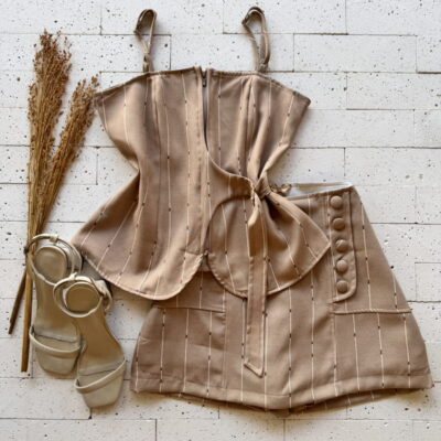 CONJUNTO ALFAIATARIA LISTRADO REGATA FIVELA E SHORT SAIA BOTÕES NUDE – Sofisticação e Modernidade