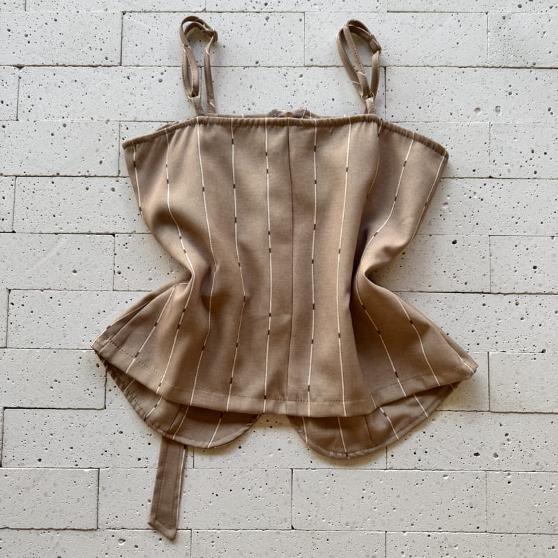 CONJUNTO ALFAIATARIA LISTRADO REGATA FIVELA E SHORT SAIA BOTÕES NUDE