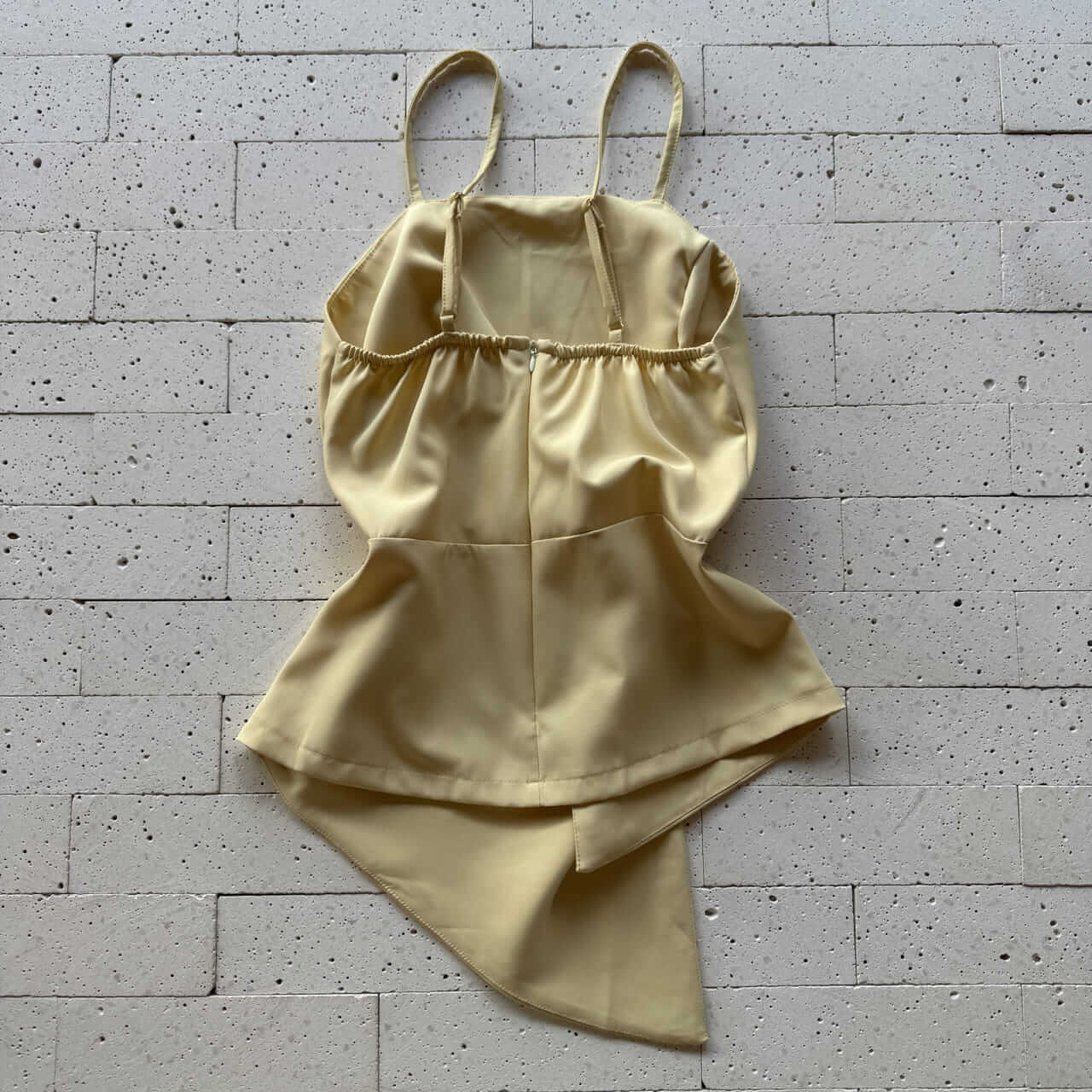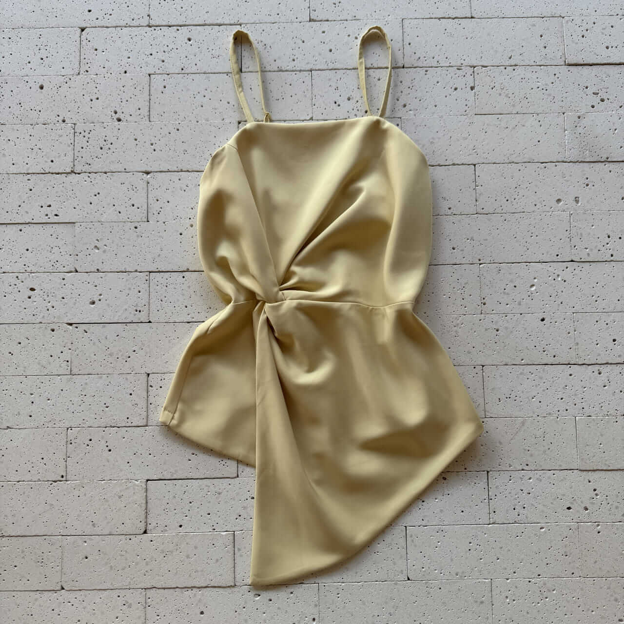 - Blusa: Regata com alças finas, detalhe frontal em nó torcido e barra assimétrica