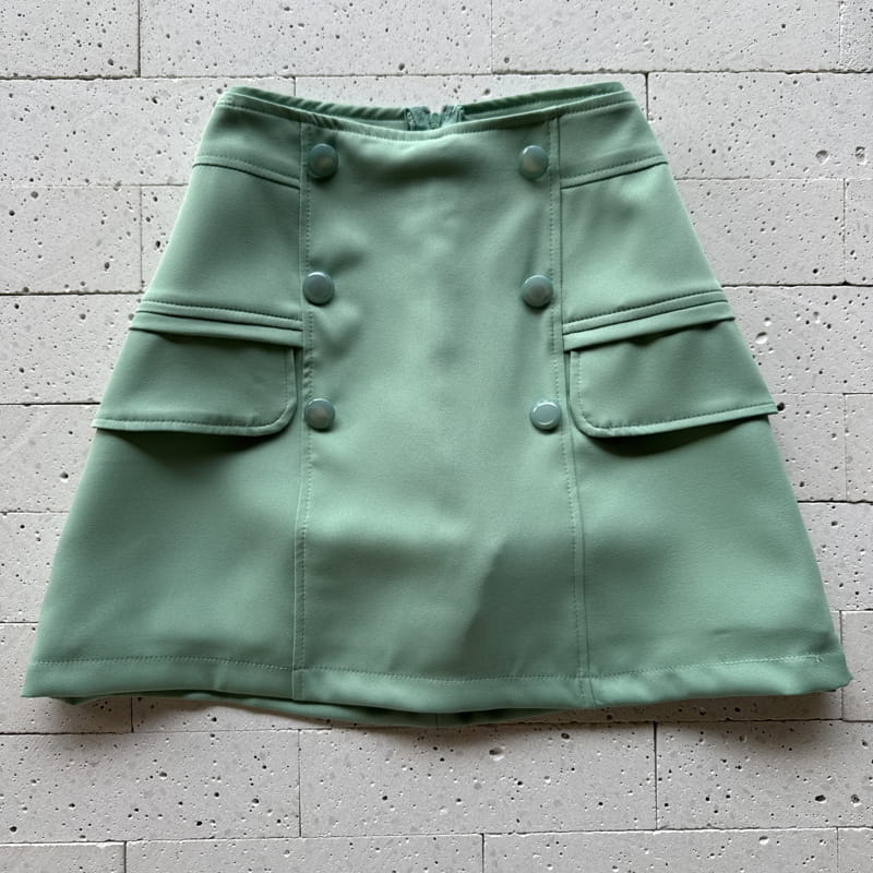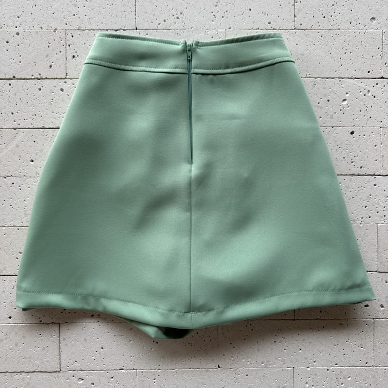 • Short saia com modelagem levemente evasê e bolsos frontais