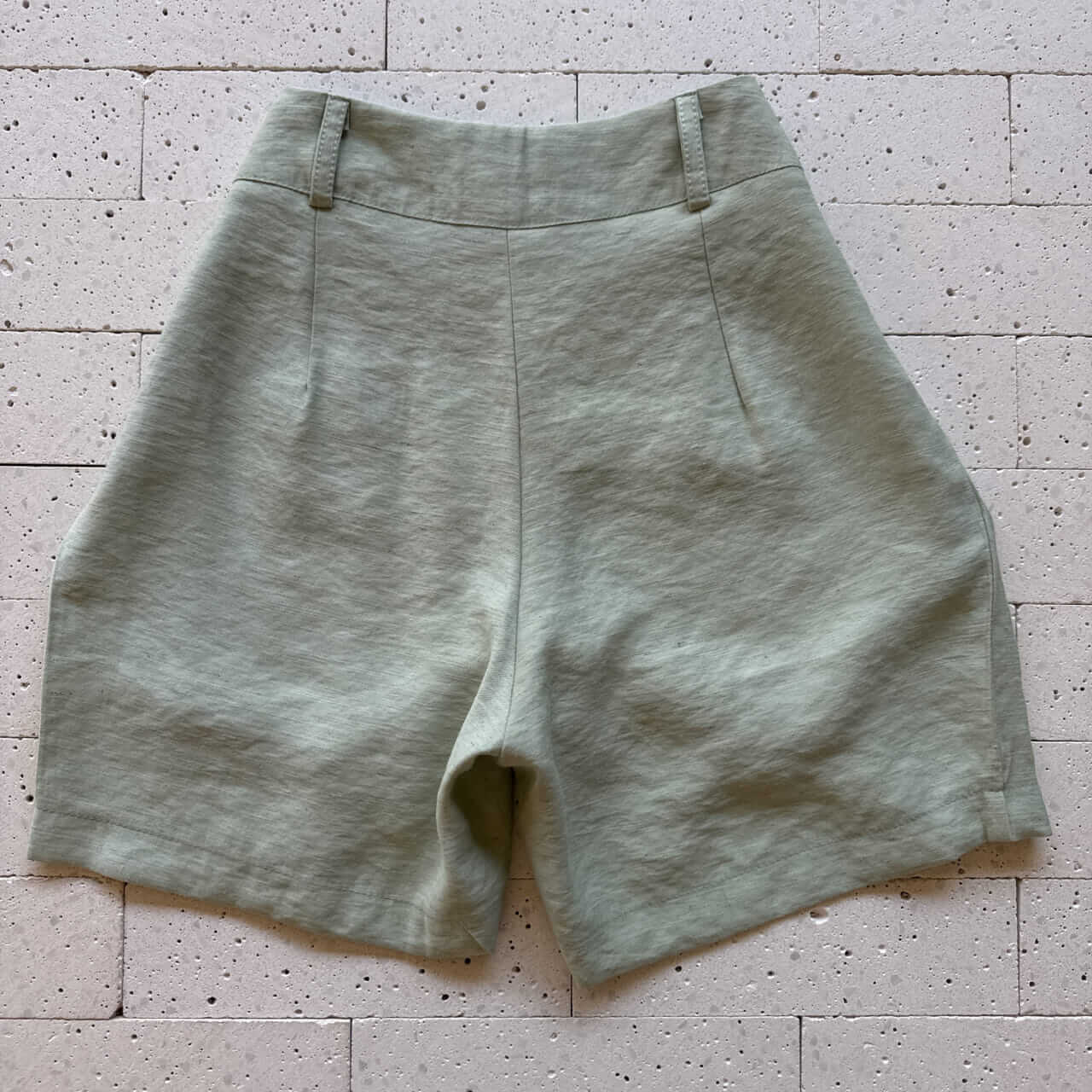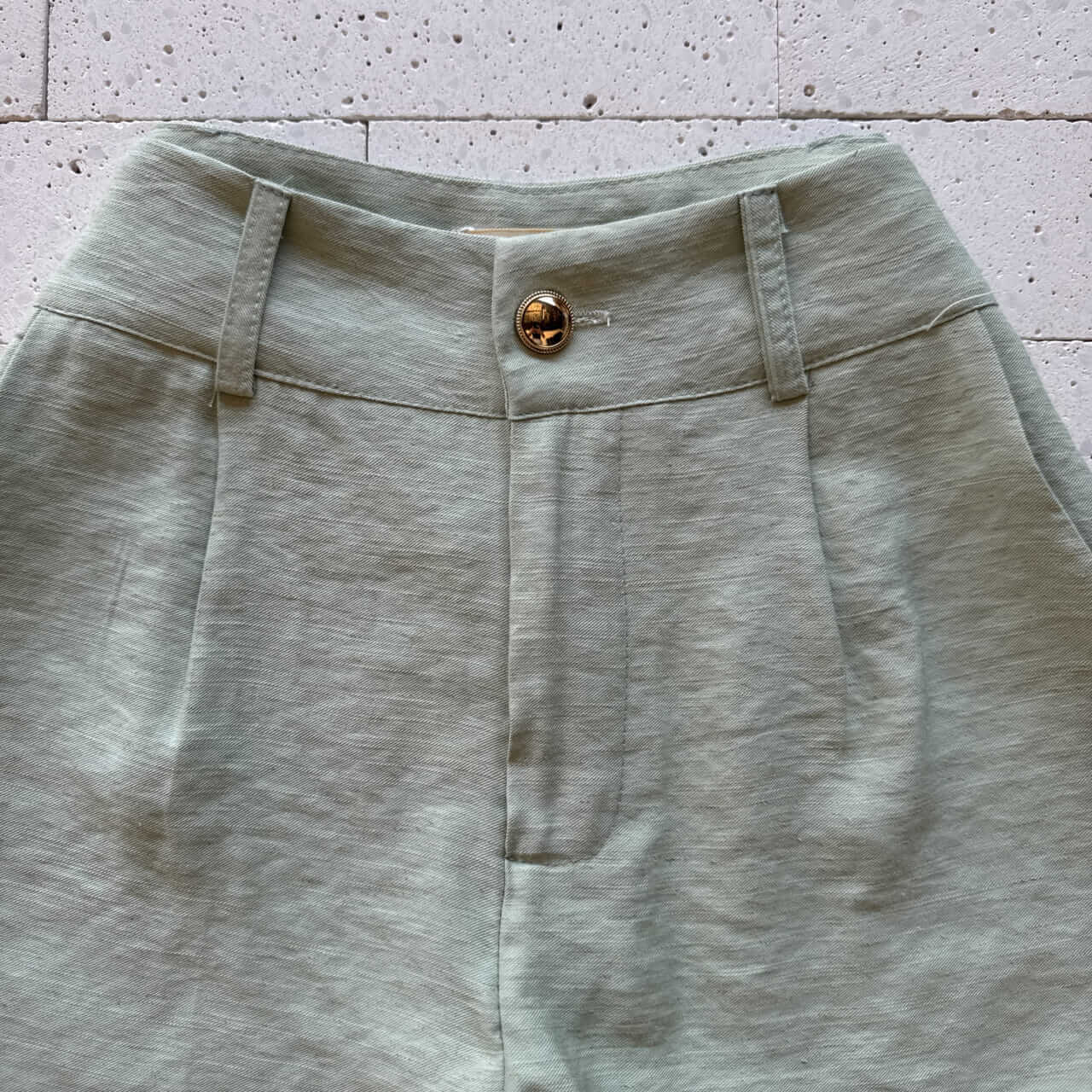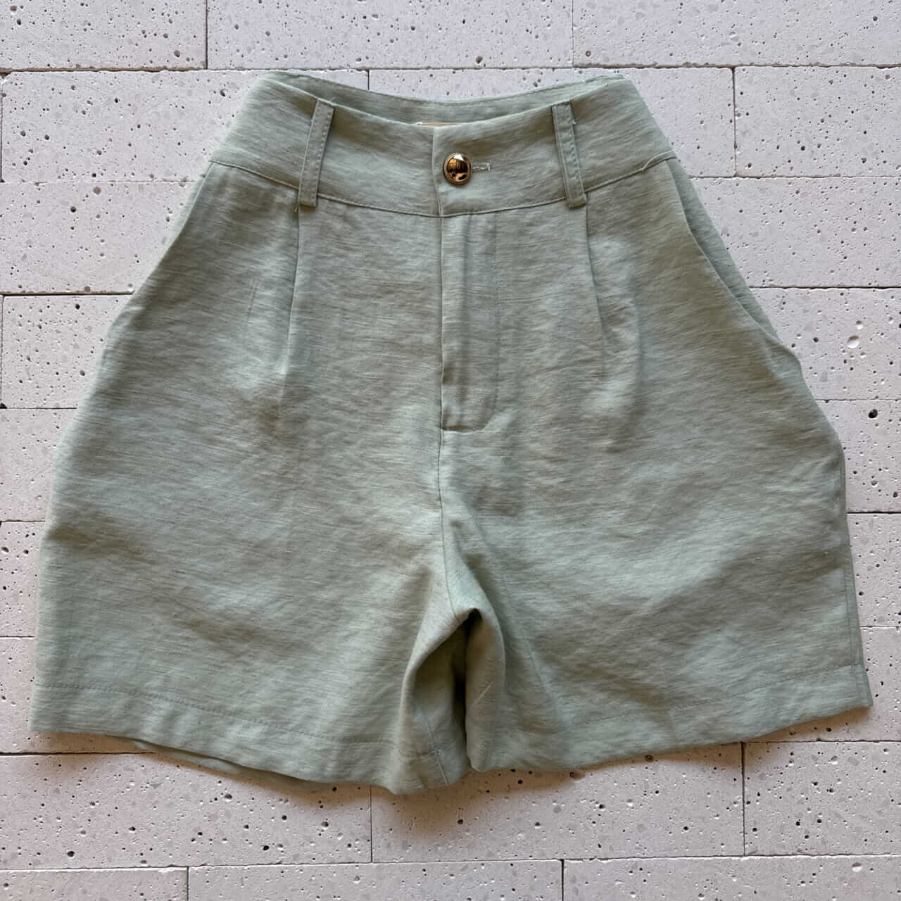 - Short com cós alto, zíper traseiro e botão dourado