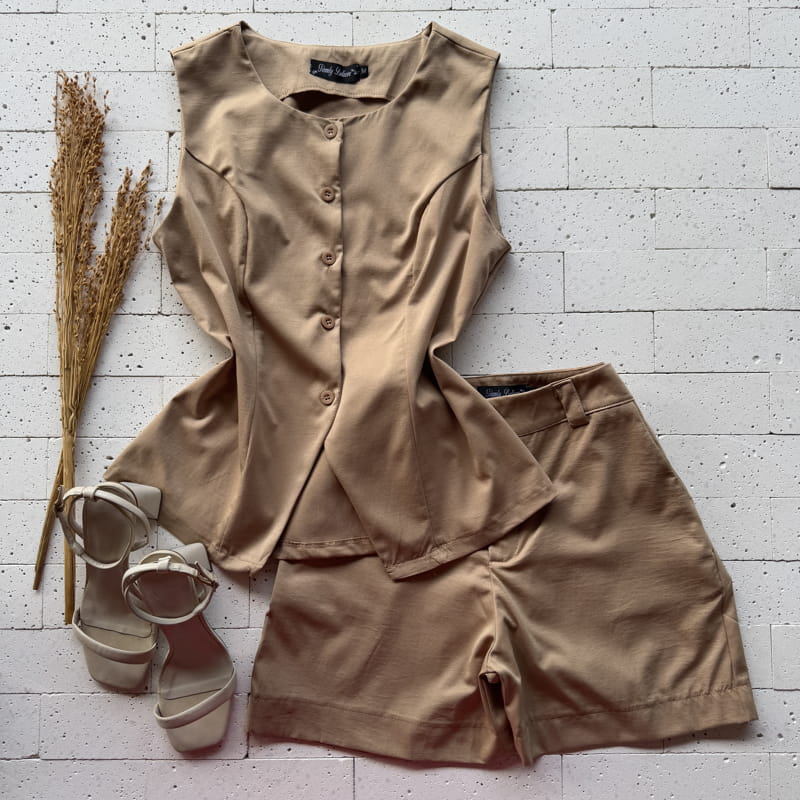 CONJUNTO BLUSA BOTÕES BARRA ASSIMÉTRICA E SHORT NUDE – Elegância com Conforto
