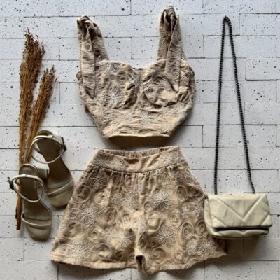 CONJUNTO BORDADO CROPPED ALÇA LACINHO E SHORT BEGE – Delicadeza e Estilo