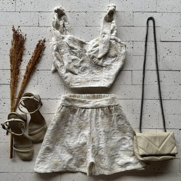 CONJUNTO BORDADO CROPPED ALÇA LACINHO E SHORT OFF