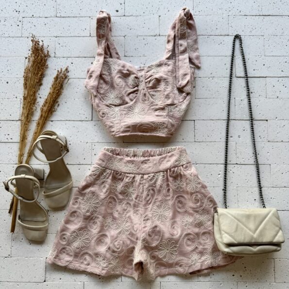 CONJUNTO BORDADO CROPPED ALÇA LACINHO E SHORT ROSÊ – Elegância Bordada