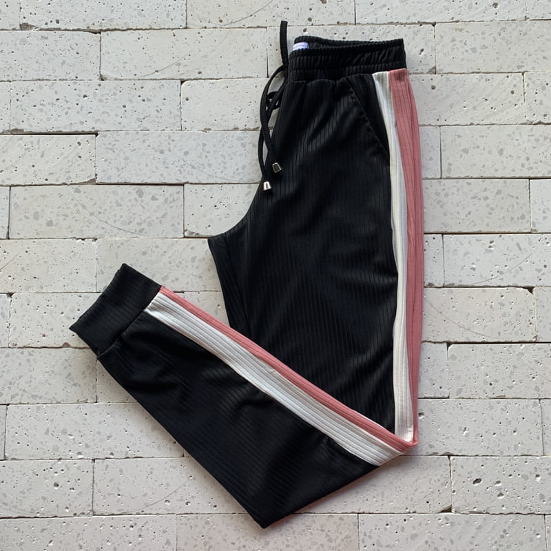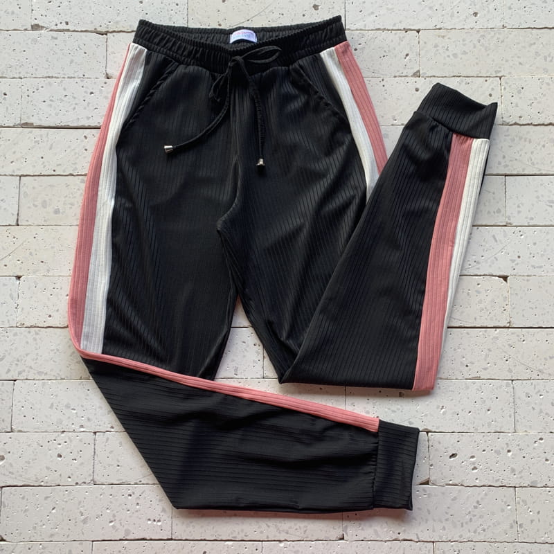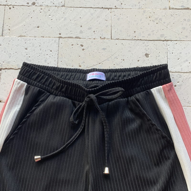 CONJUNTO CANELADO TRICOLOR MANGA CURTA PRETO E ROSÊ