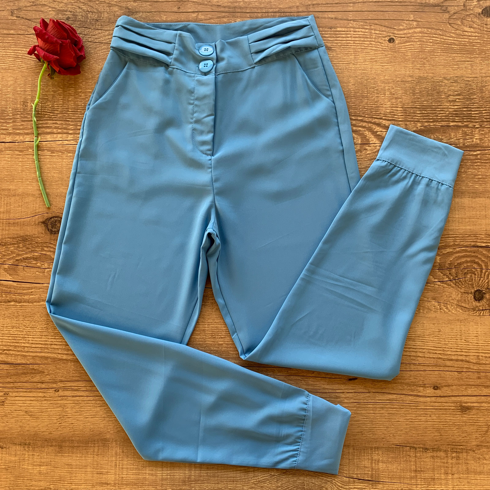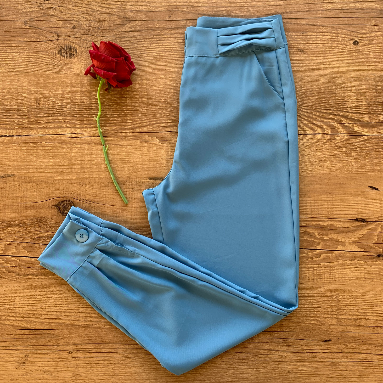 - Calça contém abertura em zíper e botão resinado funcional;