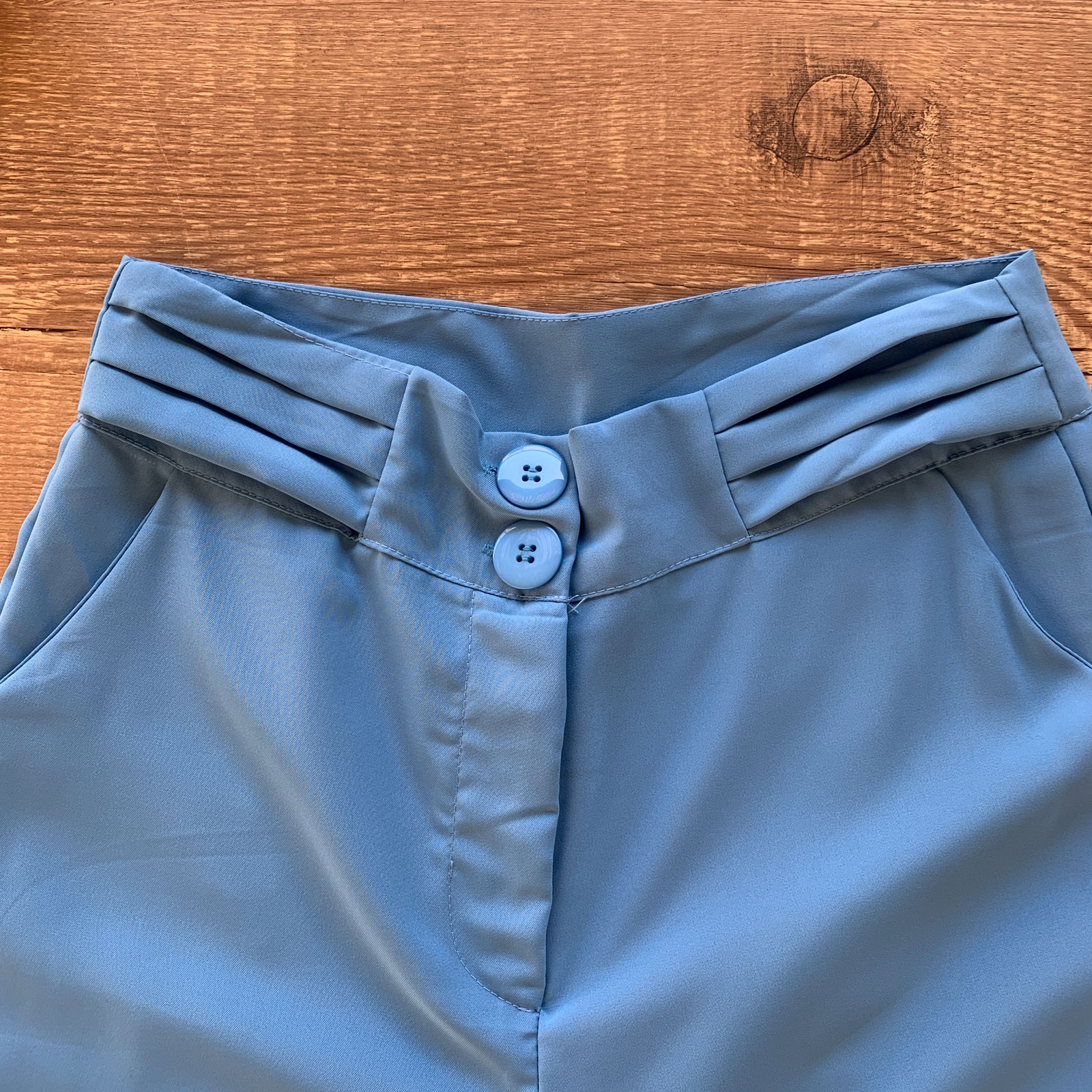 - Acabamento em pregas e botão resinado na barra;