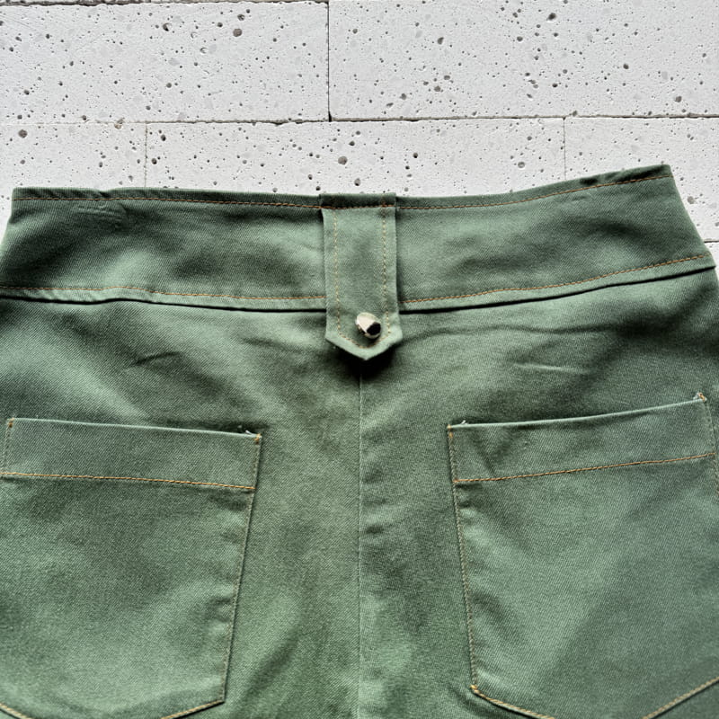 - Calça de cós alto com zíper frontal e detalhe em botão