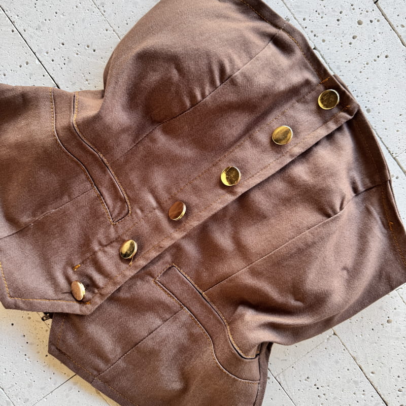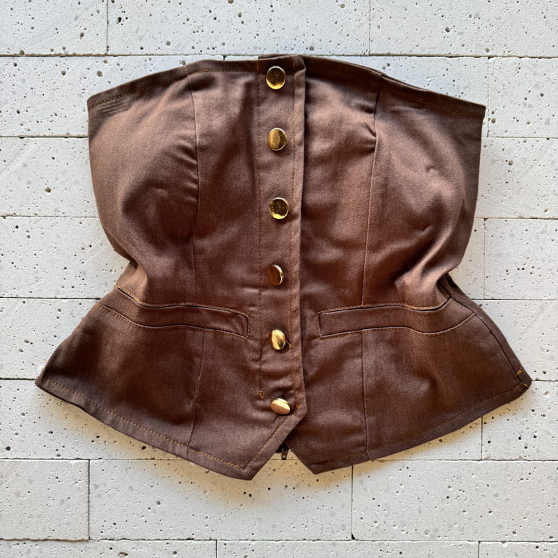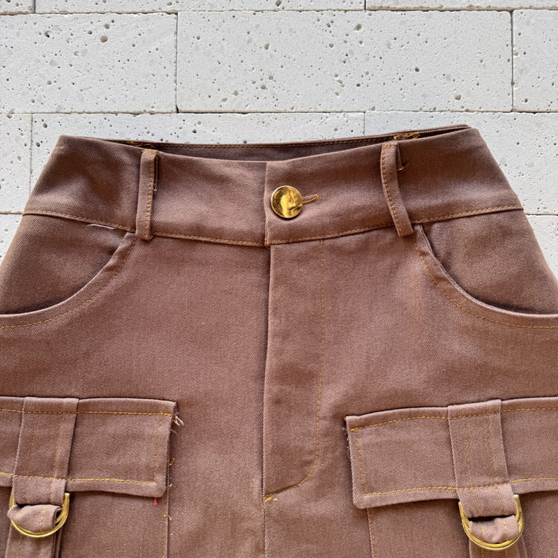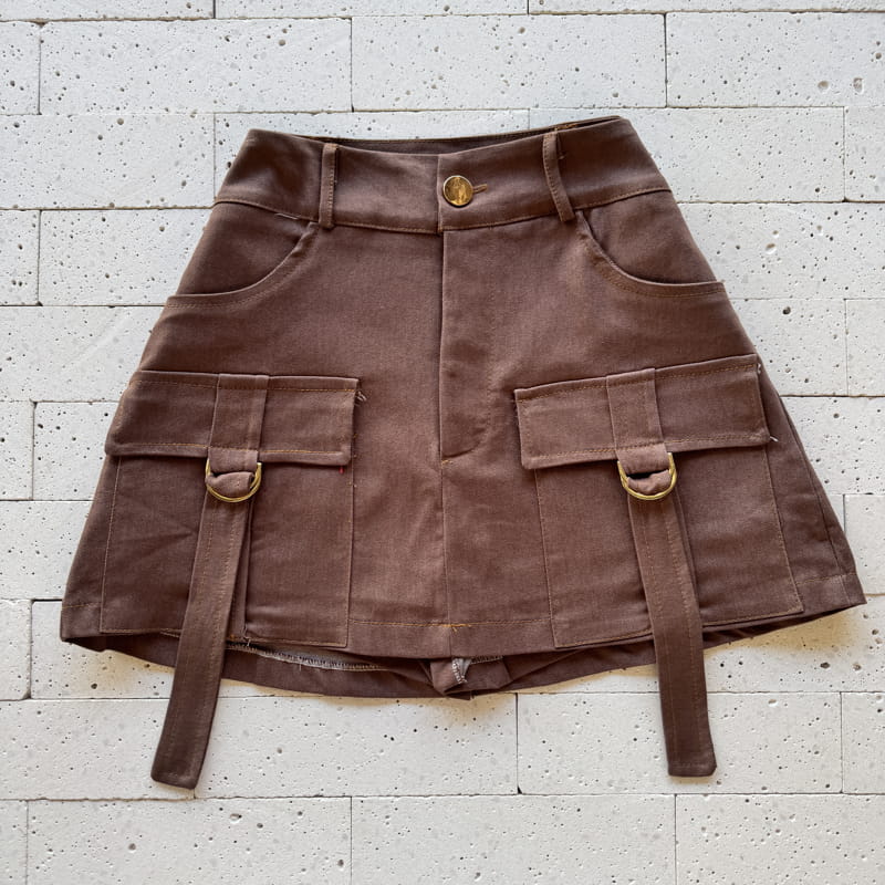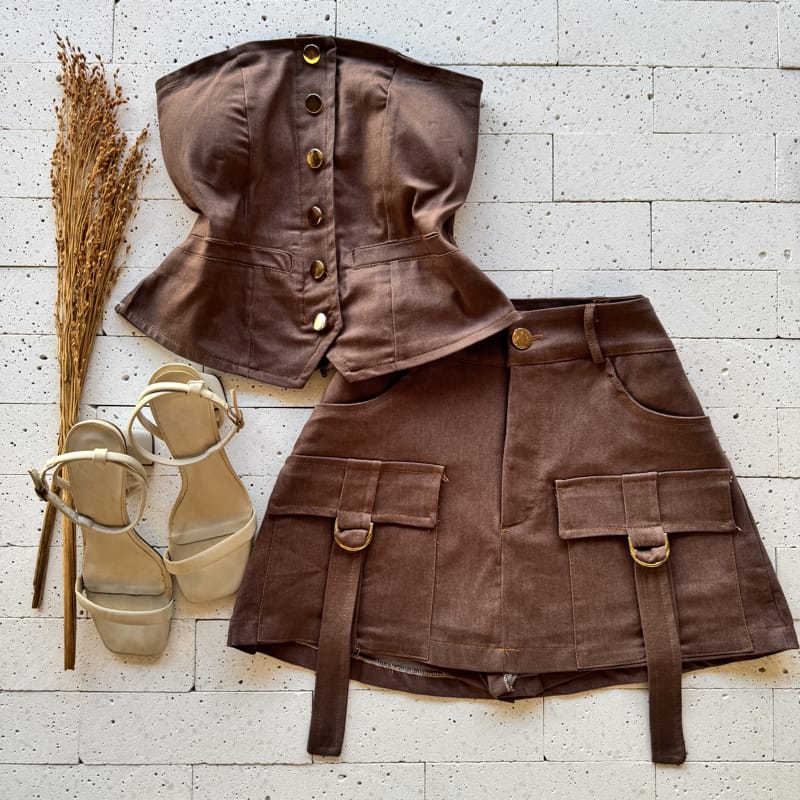 CONJUNTO COTTON TOMARA QUE CAIA E SHORT SAIA CARGO BOTÕES DOURADO MARROM – Estilo e Modernidade
