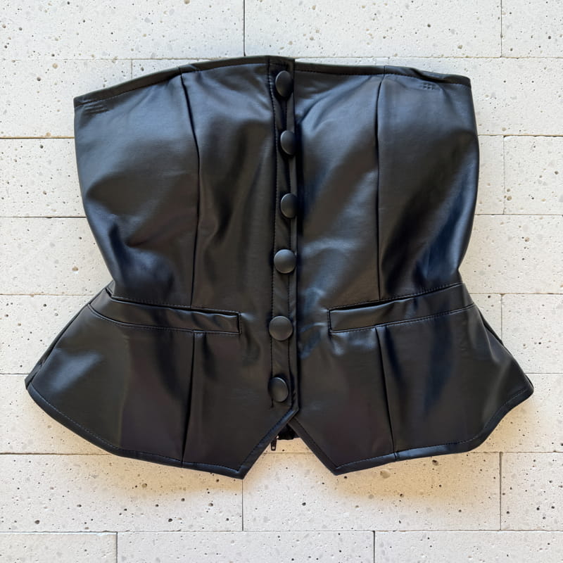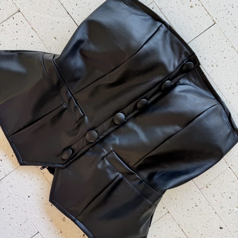 O Conjunto Couro Sintético Preto é a escolha certa para quem quer se destacar. A blusa tomara que caia traz bojo interno, recortes que realçam o busto e fechamento nas costas com zíper e elástico, garantindo segurança e conforto. O short saia em cintura média conta com lapelas, tiras decorativas e argolas metálicas que dão um toque moderno à peça. Feito em couro sintético macio e estruturado, proporciona caimento firme sem transparência.