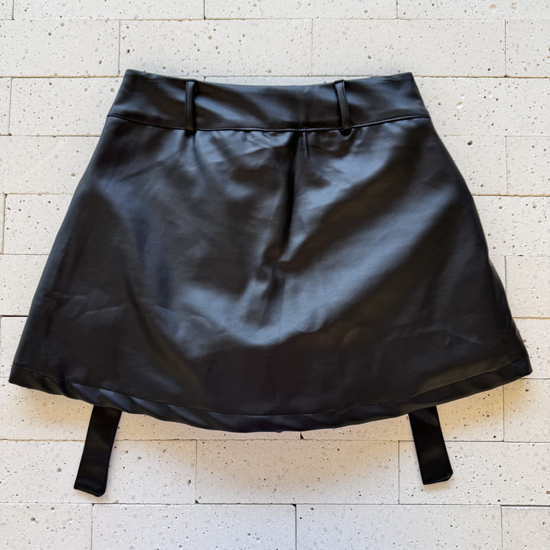 - Short saia cintura média com lapelas, tiras e argolas douradas
