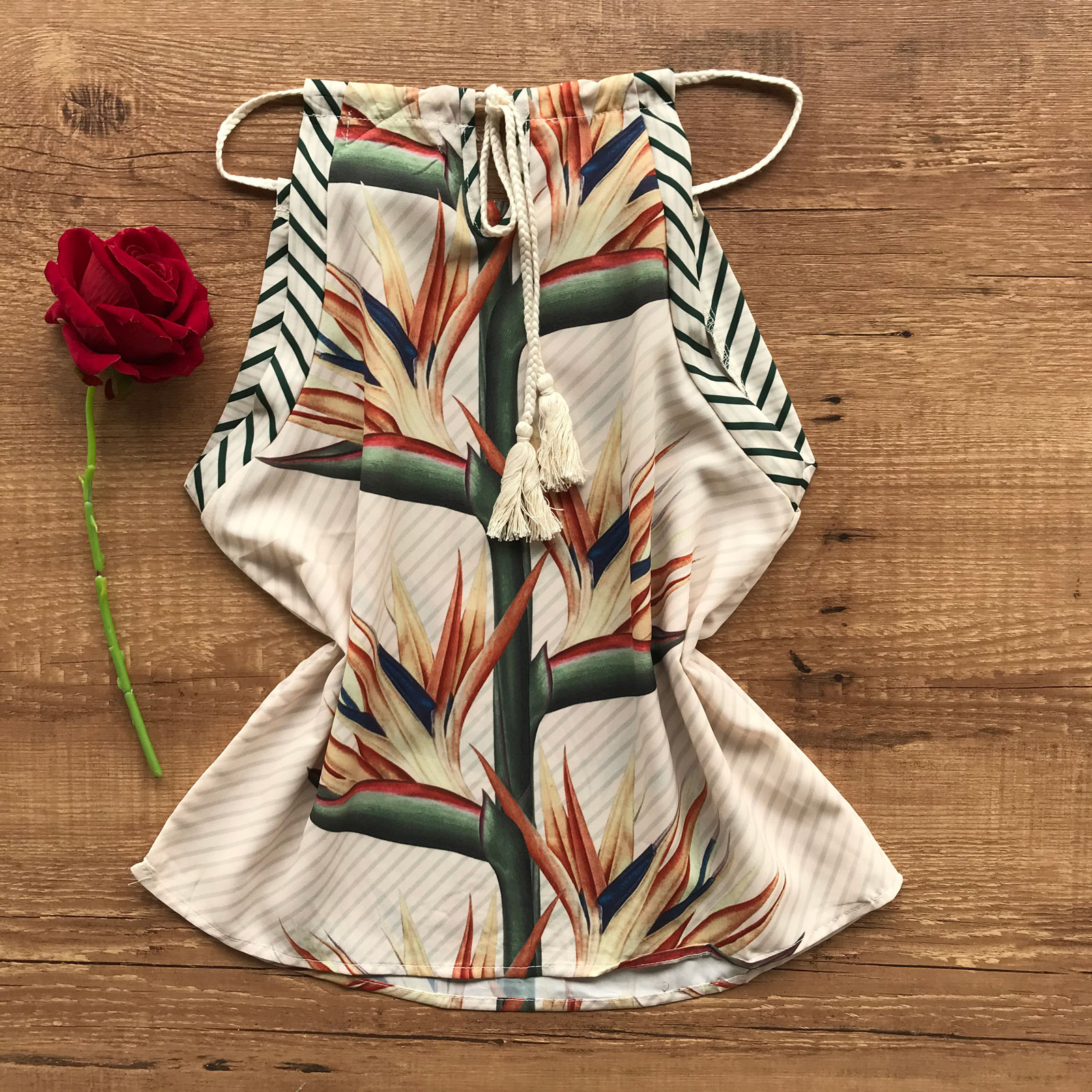 O Conjunto Crepe Short Estampado Nude e Verde é a escolha certa para quem ama a versatilidade. Composto por regata e short, é confeccionado em crepe de alta qualidade, com caimento impecável. A regata possui alças com amarração em cordão, reguláveis, e seu modelo é frente única, com decote reto. O short é listrado e seu comprimento é curto. Apresenta passantes e fechamento em botão e zíper frontais. Conta com bolsos faca funcionais na parte da frente e vincos na parte de trás.