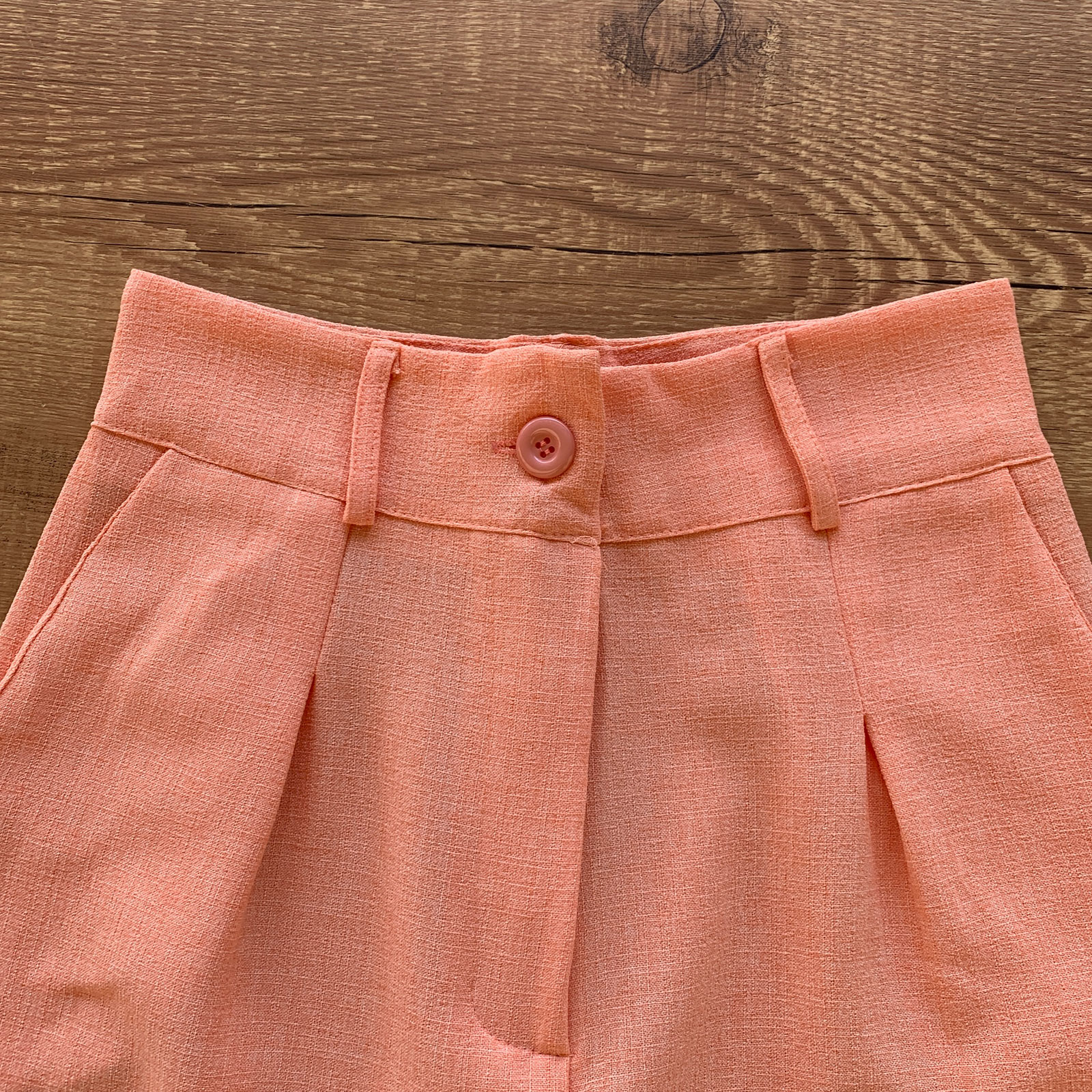- Calça possui fechamento em zíper e botão resinado funcional;