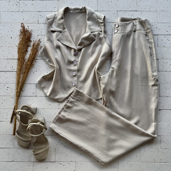 Perfeito para quem busca um look moderno e sofisticado, o Conjunto Cropped Golinha e Calça Pantalona com Botões Perolados Crú é a escolha ideal para diversas ocasiões. O cropped sem mangas possui gola estruturada e botões perolados delicados, garantindo um toque de sofisticação ao visual. A calça pantalona apresenta modelagem ampla e cós alto, proporcionando um caimento impecável. Confeccionado em tecido leve e com um toque suave, este conjunto é sinônimo de elegância e conforto.