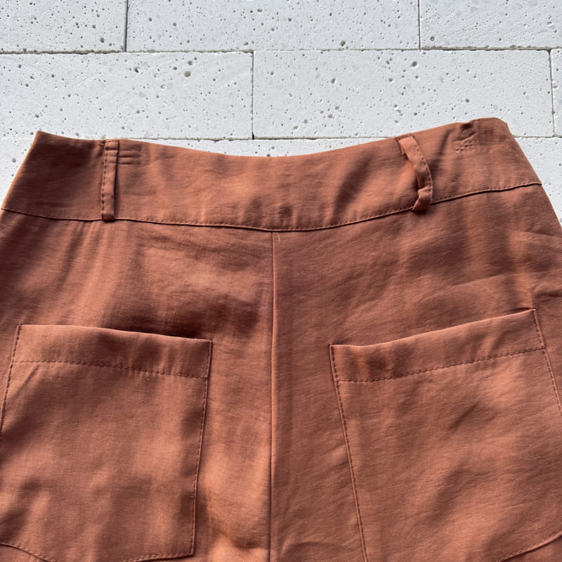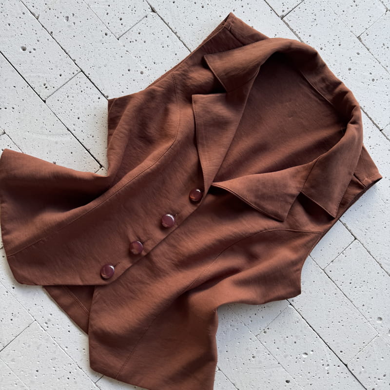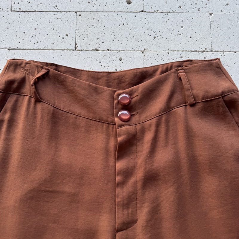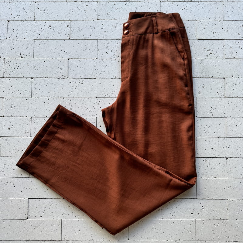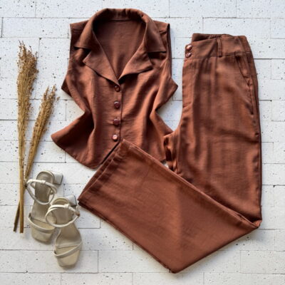 CONJUNTO CROPPED GOLINHA E CALÇA PANTALONA COM BOTÕES PEROLADOS CARAMELO – Elegância e Conforto