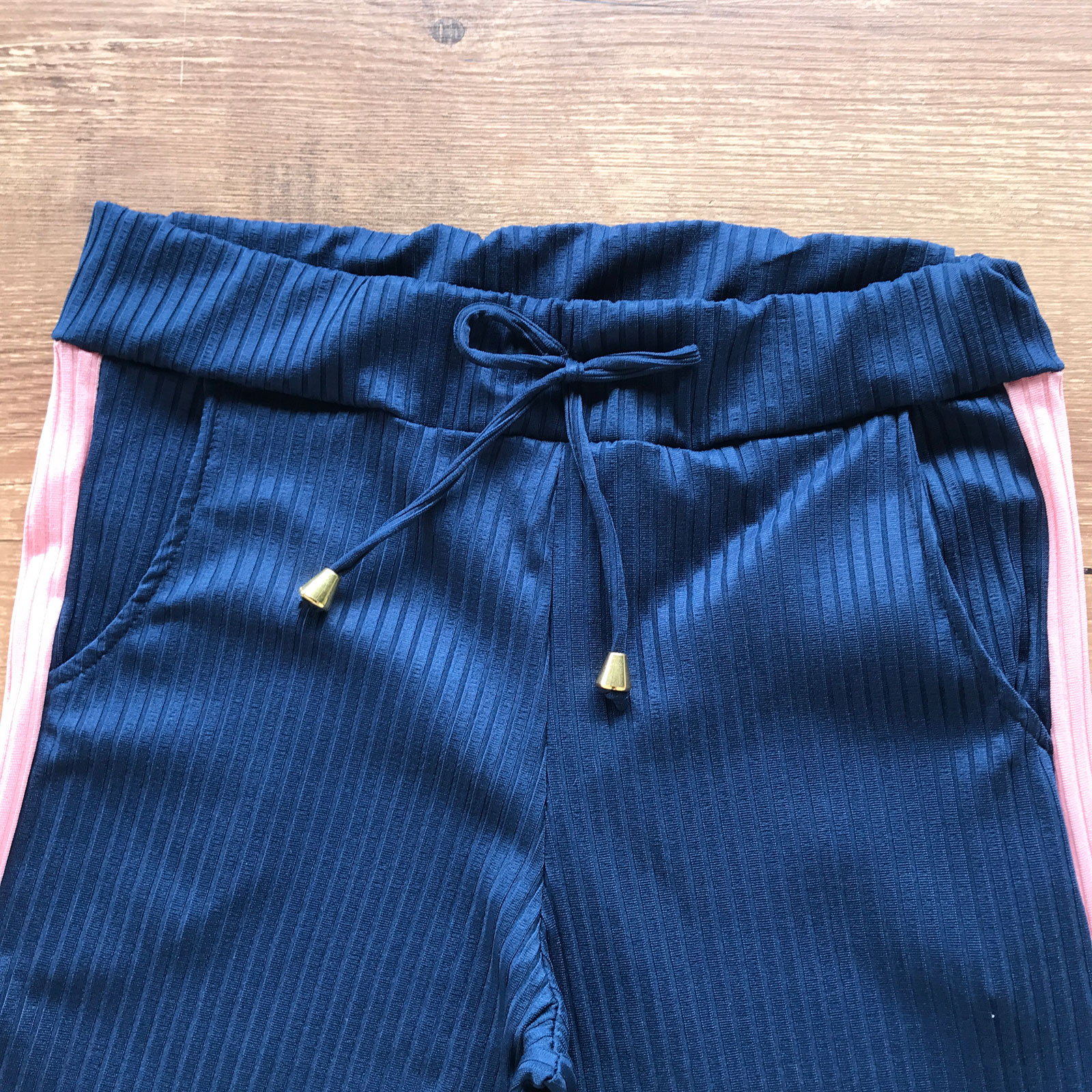 - Calça com elástico na cintura e cordão para amarração;