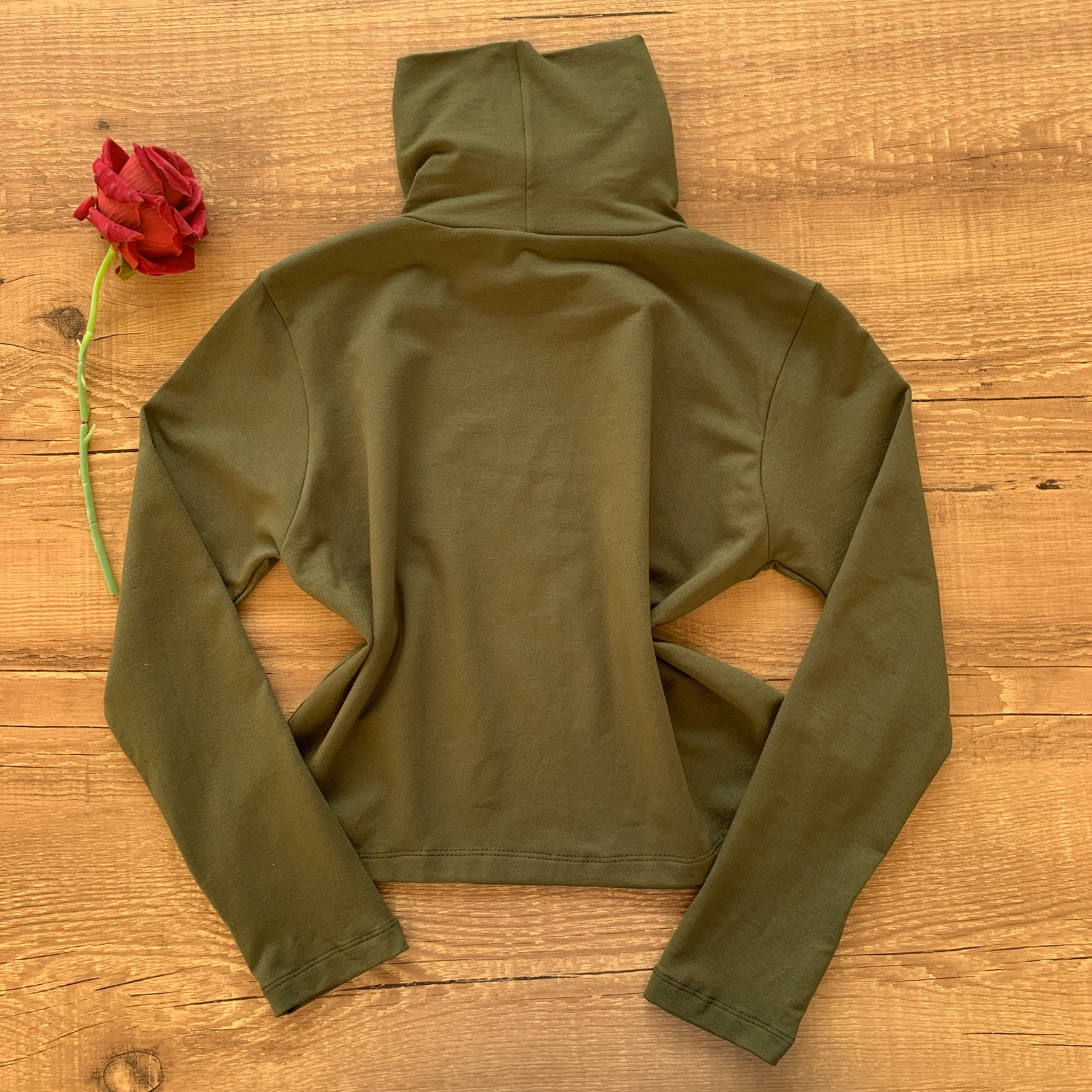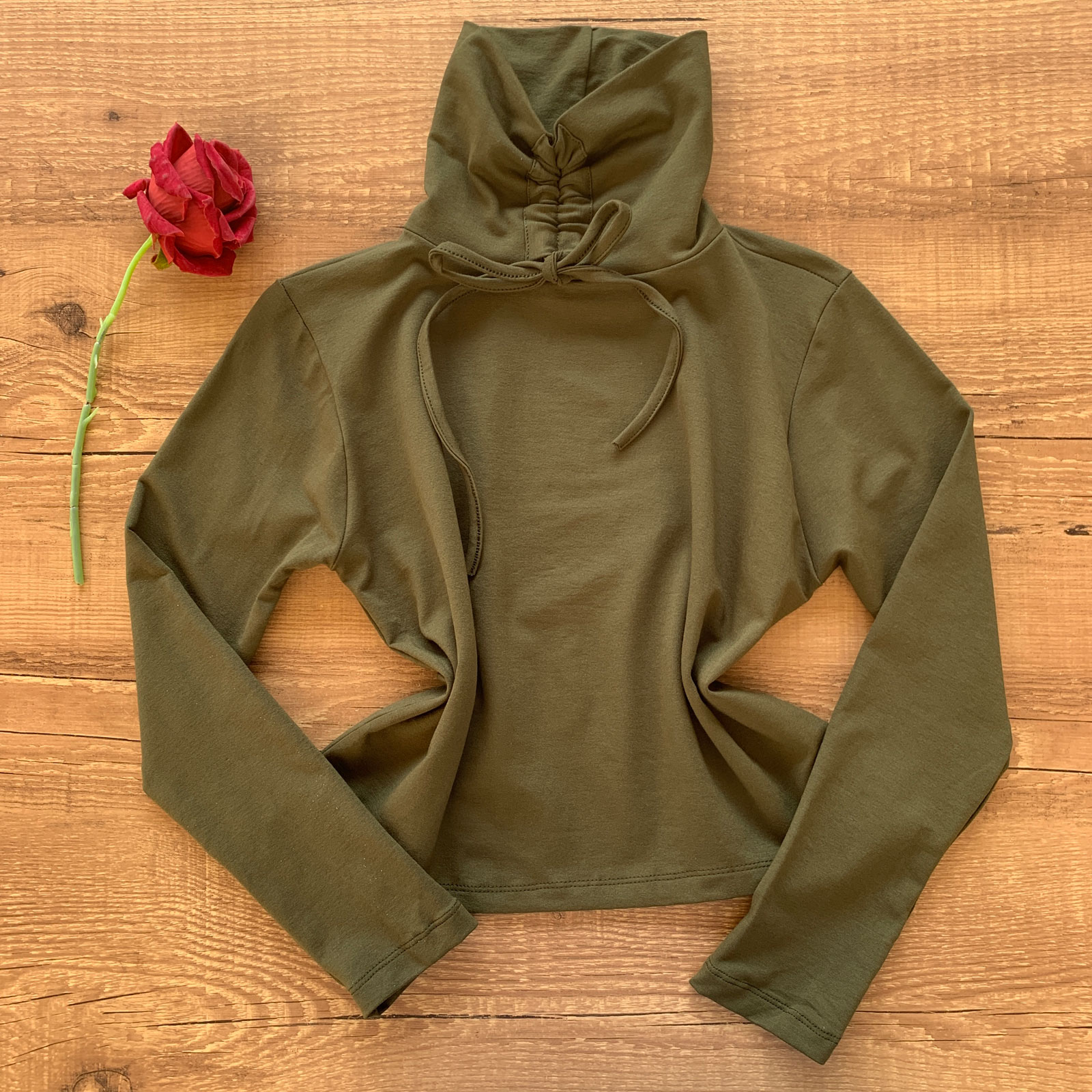 - Blusa possui gola alta com detalhe de espaço com cordões ajustáveis;