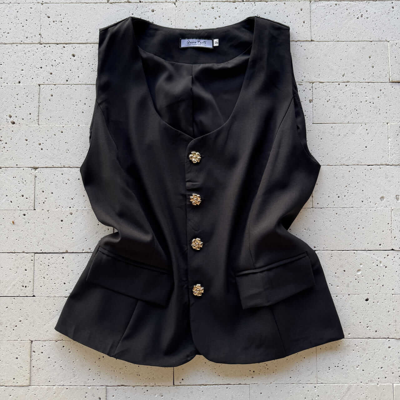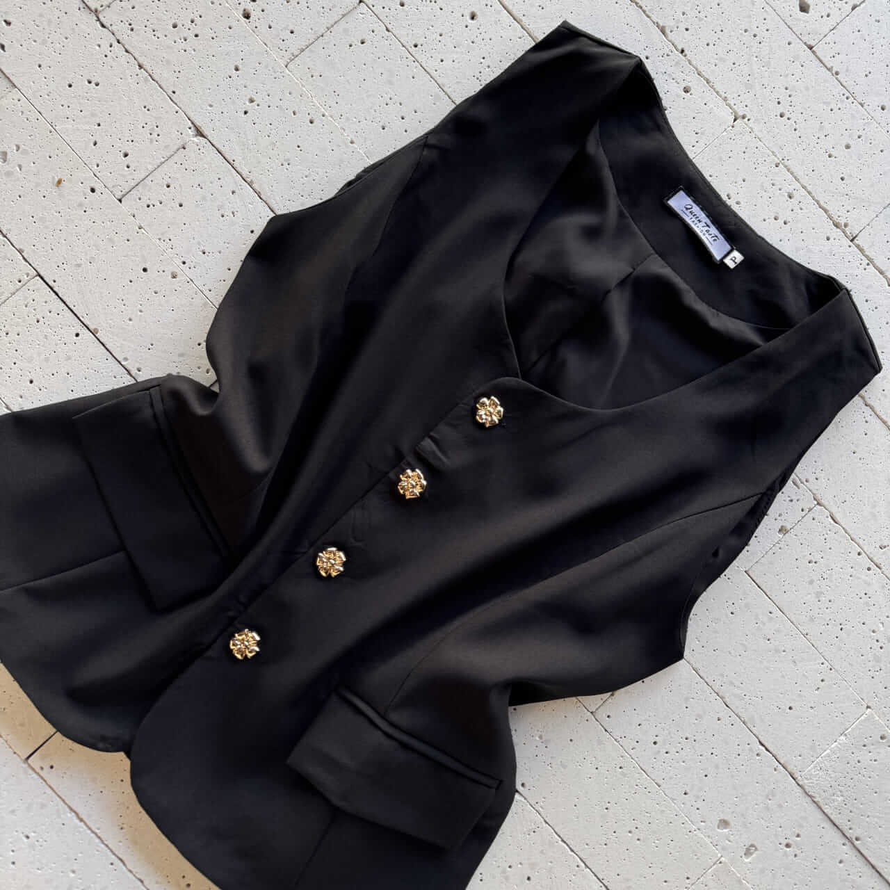 Este conjunto preto é a definição de elegância minimalista com toque moderno. Composto por blusa tipo colete estruturado e short saia forrado, o modelo apresenta alfaiataria delicada e acabamento impecável. A blusa possui decote em V, recortes que valorizam a cintura e botões dourados com design floral, que trazem charme e sofisticação. Já o short saia tem modelagem reta e acabamento liso, garantindo caimento impecável e conforto. Perfeito para composições elegantes no trabalho, eventos e ocasiões sociais.