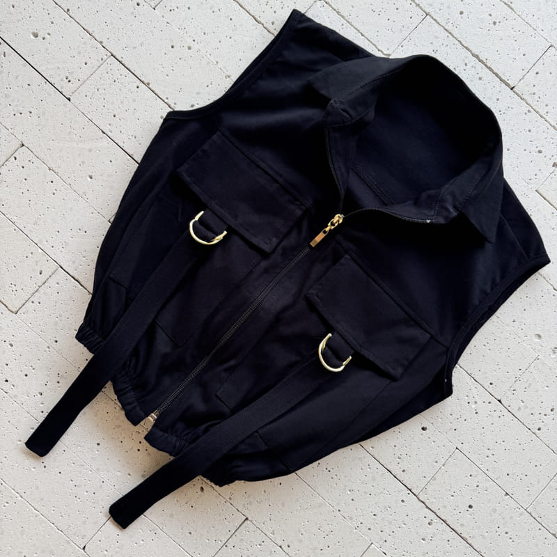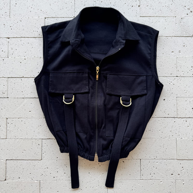 - Detalhe de bolsos frontais com lapela e tiras com argolas metálicas