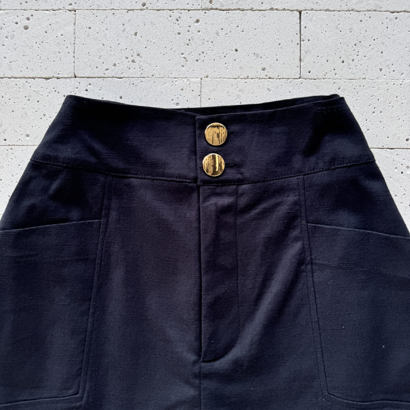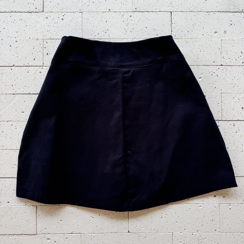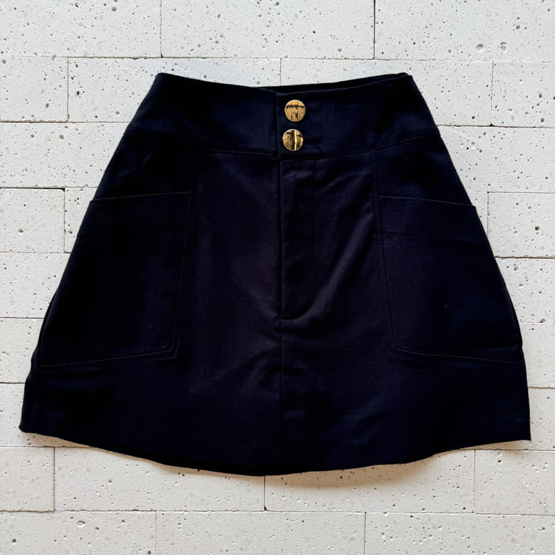 - Short saia com cintura alta e botões rajados frontais