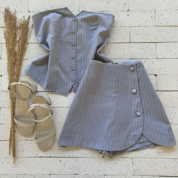CONJUNTO LINHO LISTRADO TOMARA QUE CAIA E SHORT SAIA CINZA