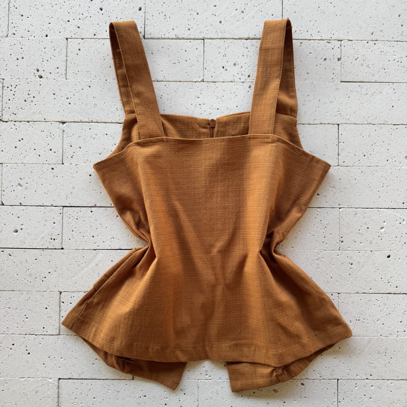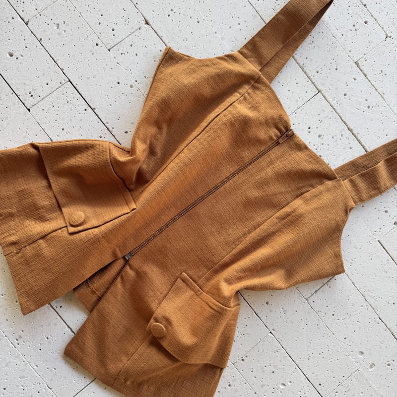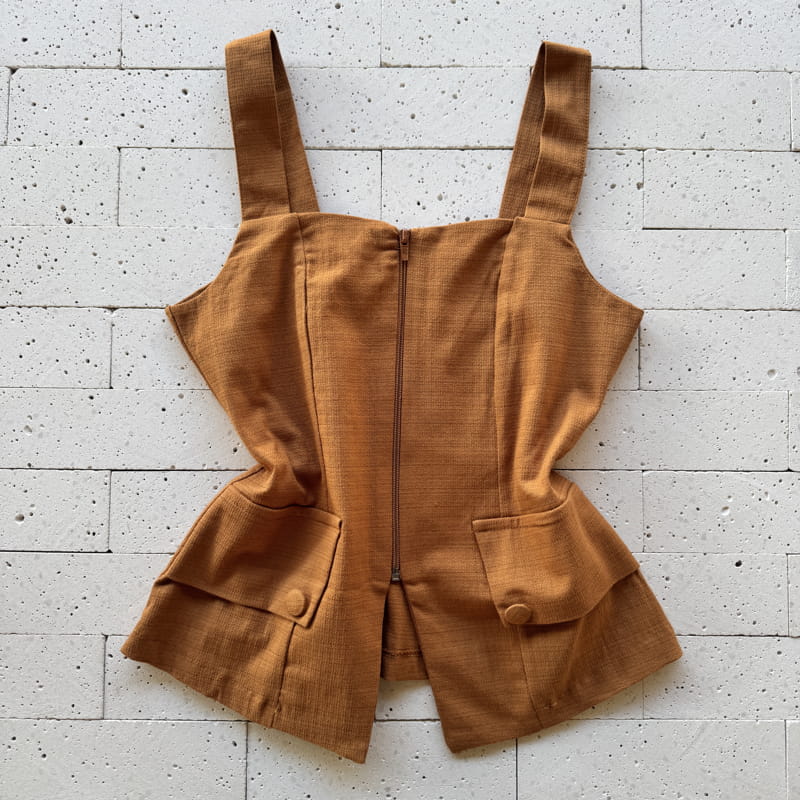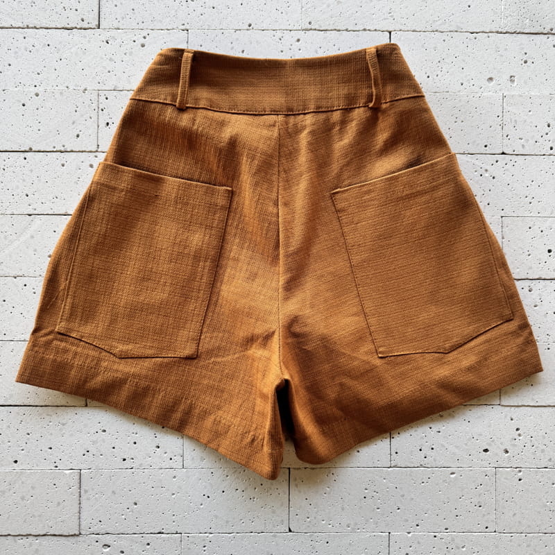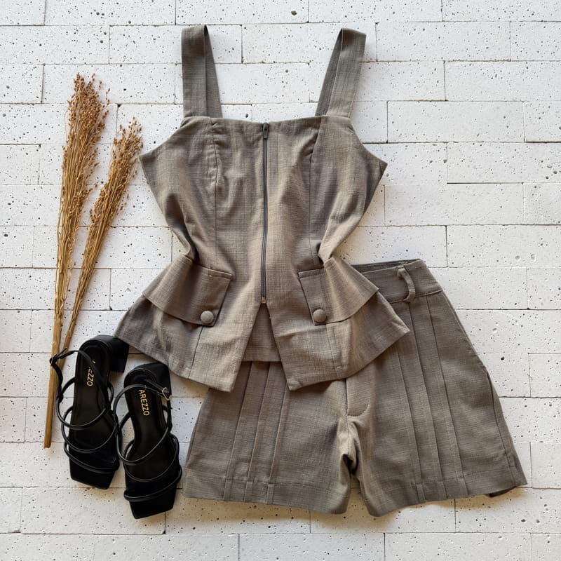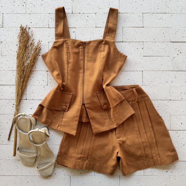 Este conjunto em linho na cor caramelo é perfeito para quem ama sofisticação com um toque moderno. A regata possui alças largas que garantem conforto e sustentação, modelagem acinturada com peplum discreto e bolsos frontais com abas e botões encapados. O zíper frontal reforça o estilo contemporâneo da peça. O short tem pregas estruturadas, cós com passantes e fechamento com botões forrados, além de bolsos traseiros quadrados que valorizam a silhueta. O tecido com leve textura e toque encorpado proporciona caimento impecável, enquanto o elastano oferece maior liberdade de movimento.