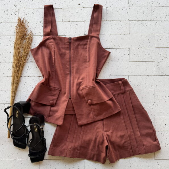 O Conjunto Linho Regata Alça Larga e Short Pregas Marrom é a escolha ideal para quem busca sofisticação com leveza nos dias mais quentes. A blusa possui alças largas que garantem conforto e sustentação, além de zíper frontal funcional e bolsos decorativos com botão forrado, criando um visual moderno e estruturado. O short conta com pregas frontais, modelagem levemente ampla e fechamento com dois botões forrados, valorizando a silhueta com charme e conforto. Um conjunto versátil que transita com facilidade entre o casual chic e o look mais elaborado.