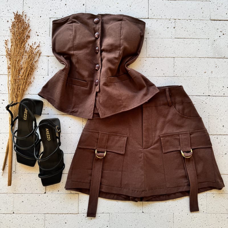 CONJUNTO LINHO TOMARA QUE CAIA E SHORT SAIA CARGO CAFÉ – Shape Elegante com Detalhes Utilitários