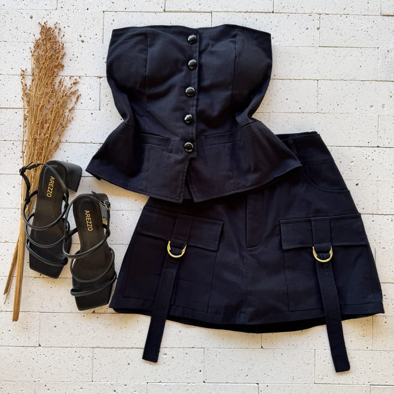 Criado para quem ama peças statement sem abrir mão do conforto, o Conjunto Linho Tomara que Caia e Short Saia Cargo Café combina bustiê estruturado com botões + short saia utilitário com bolsos cargo e argolas metalizadas. O tecido misto de algodão, linho e elastano entrega toque natural, leveza e sutil elasticidade, enquanto o elástico traseiro do top garante ajuste perfeito ao busto. Resultado: um look moderno, feminino e versátil, pronto para te acompanhar do day-to-night sem esforço.