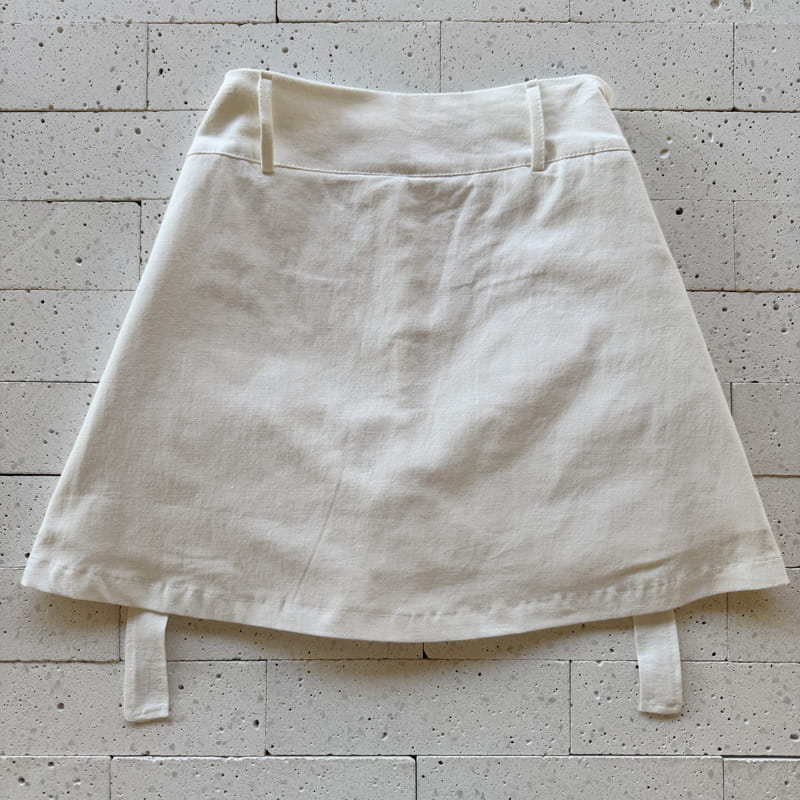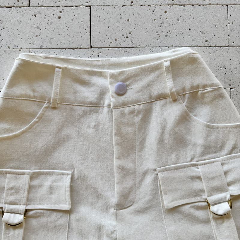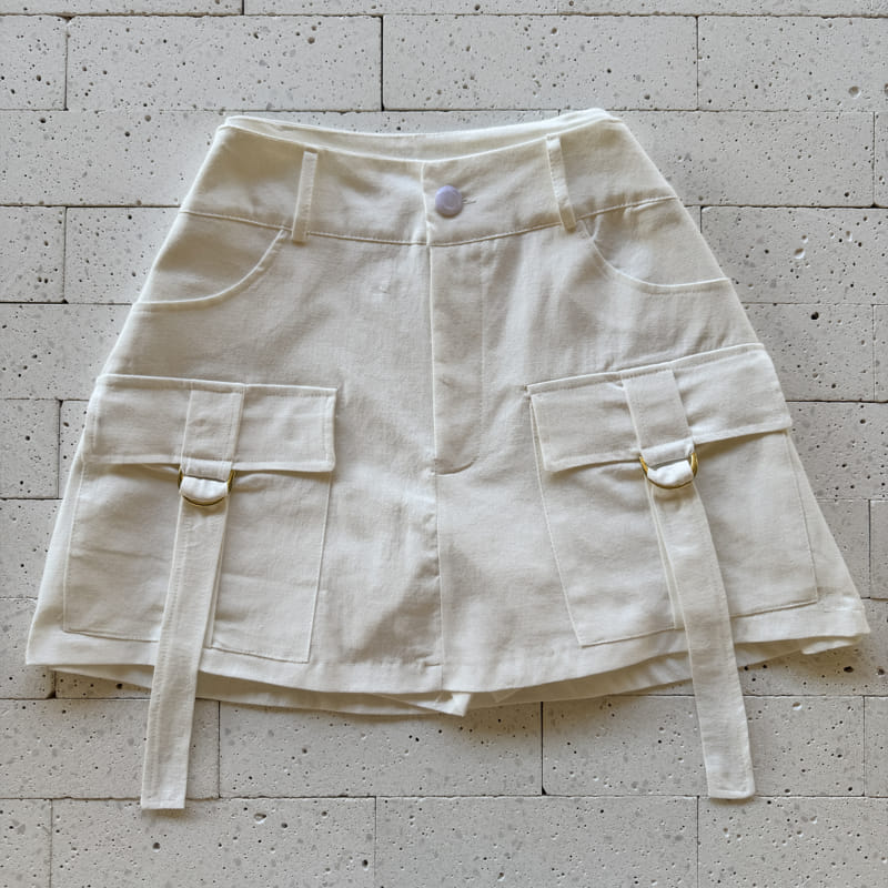 - Short saia cargo com bolsos frontais, lapelas, tiras utilitárias e argolas metalizadas douradas