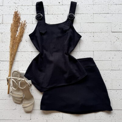 CONJUNTO LINHO TRABALHADO REGATA FIVELA NA ALÇA E SHORT SAIA PRETO – Sofisticação e Estilo Atemporal
