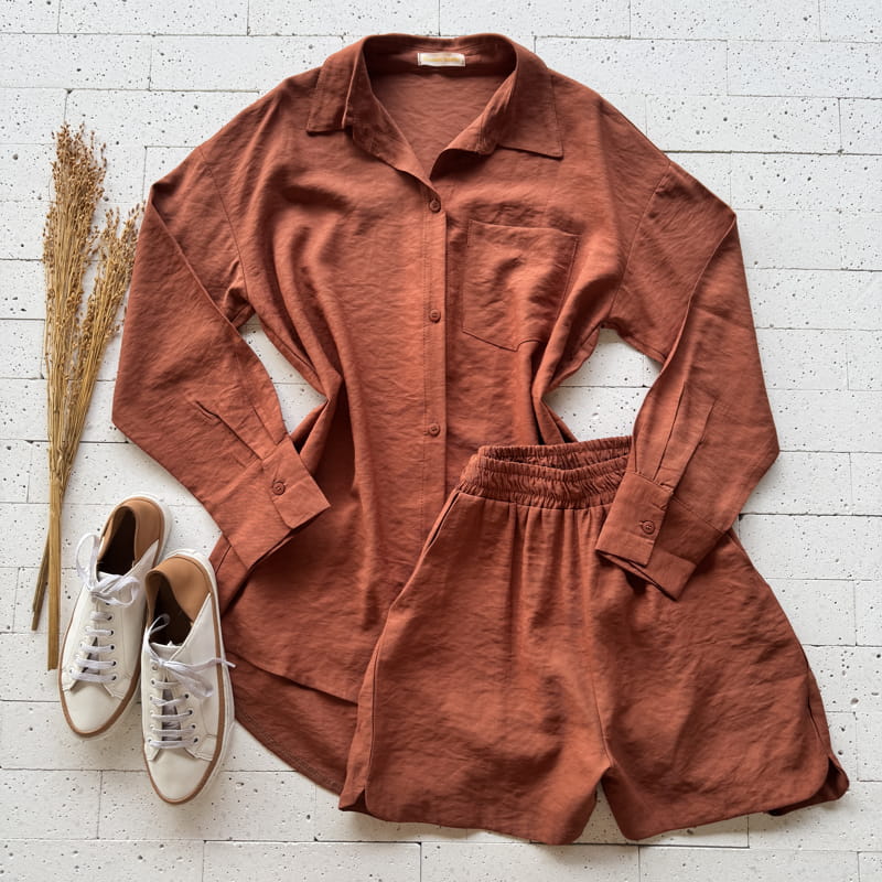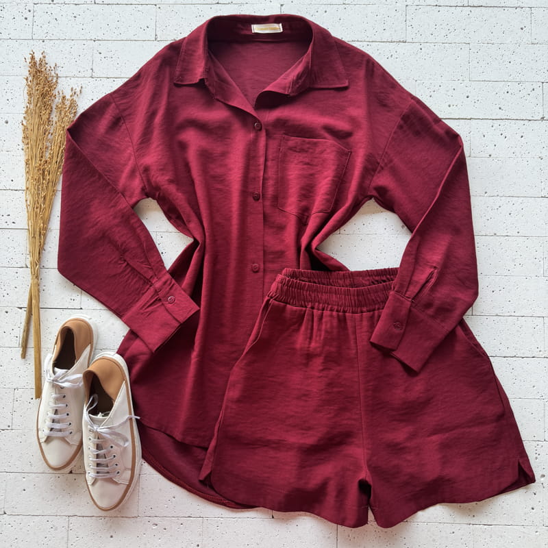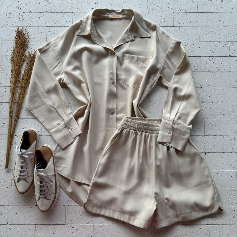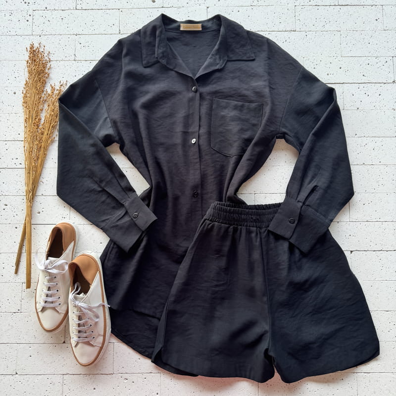 Esse conjunto é a definição de estilo minimalista com sofisticação. A camisa longa tem modelagem ampla e elegante, com caimento fluido, que eleva a produção mesmo nas propostas mais básicas. Possui bolso frontal funcional, colarinho clássico e botões frontais, além de punhos largos com abotoamento duplo. O short acompanha a proposta confortável e moderna, com elástico na cintura que se ajusta com facilidade ao corpo, cós médio e comprimento equilibrado. A peça é confeccionada em 100% poliéster, com toque suave e leve brilho que realça a cor preta profunda da composição. Ideal para criar looks sofisticados e casuais com apenas um conjunto.