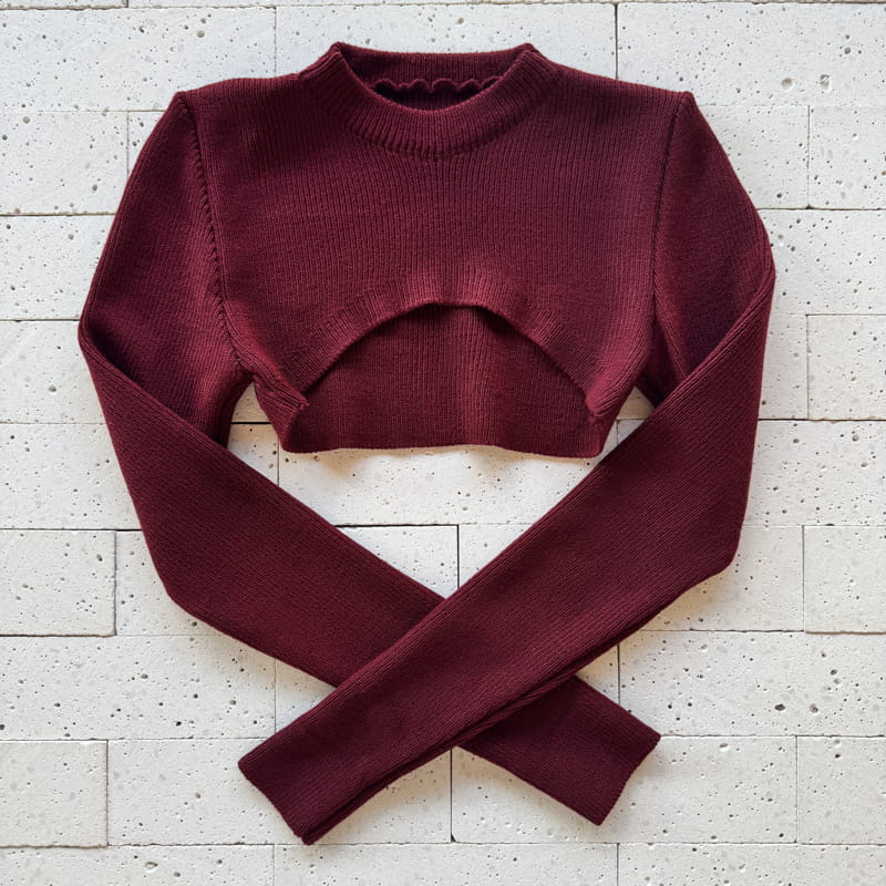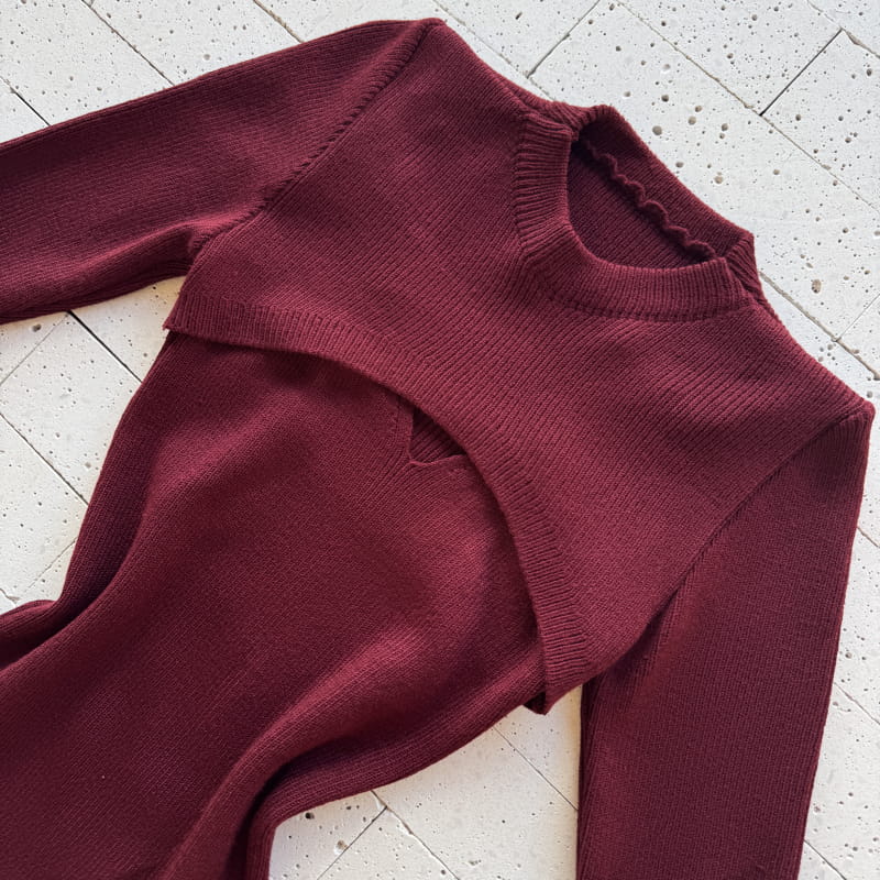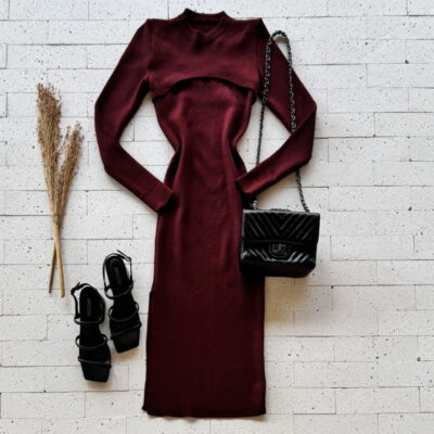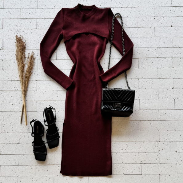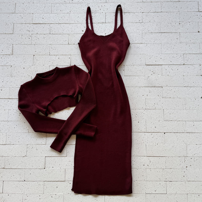 CONJUNTO MODAL CANELADO VESTIDO MIDI E CROPPED DE SOBREPOR VINHO