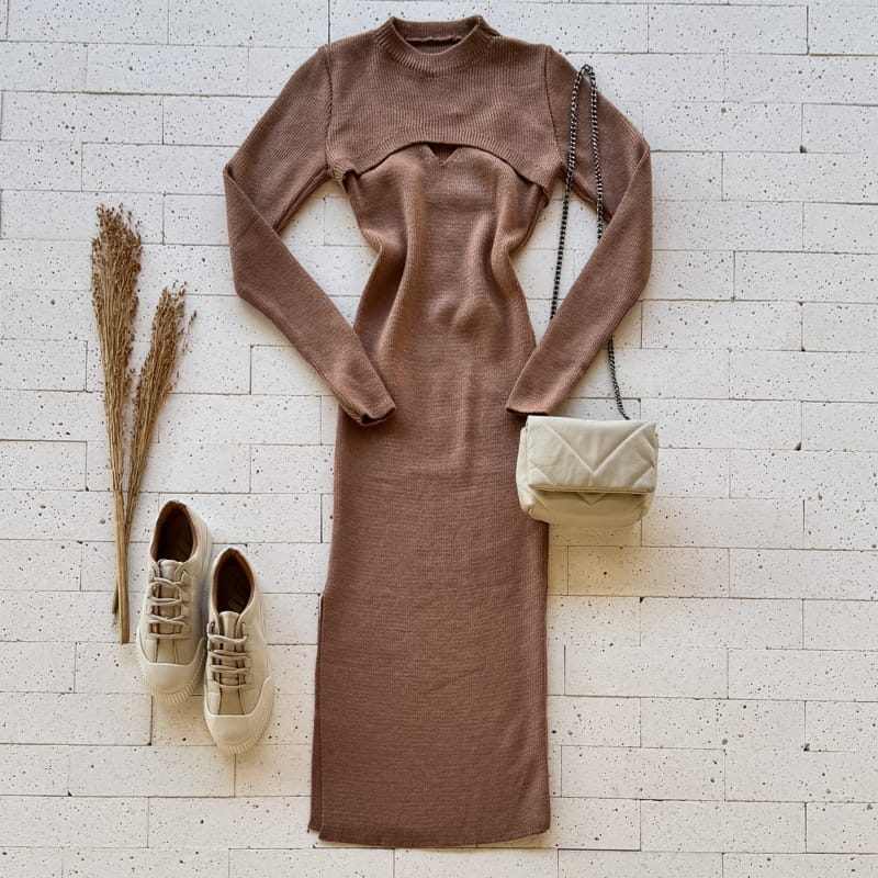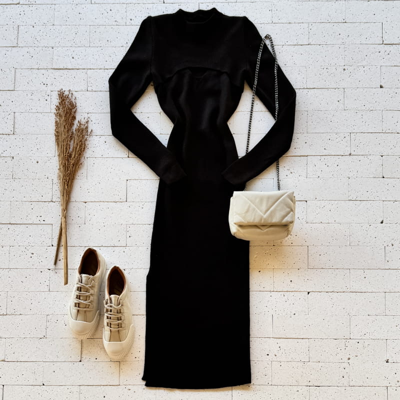 - Conjunto composto por vestido midi com alças finas e cropped de sobrepor com manga longa