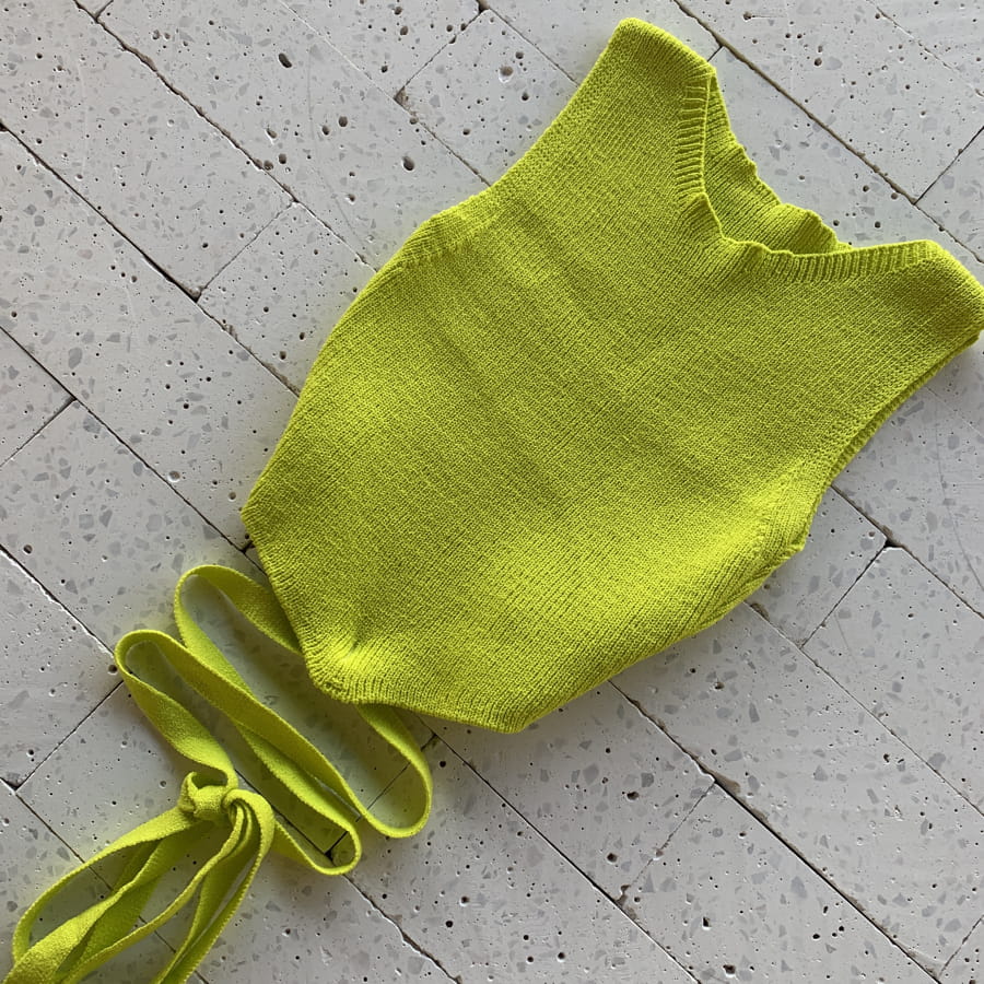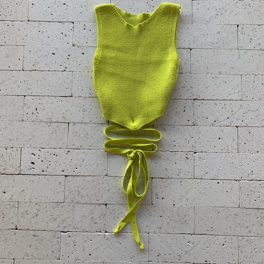 As mangas estilo regata dão mobilidade à região e evidenciam os ombros. O recorte assimétrico dá alongamento ao corpo. A amarração embutida no cropped permite criar diferentes padrões de laços. O detalhe em elástico na cintura auxilia na marcação da cintura. A fenda lateral adiciona sensualidade de forma sutil.