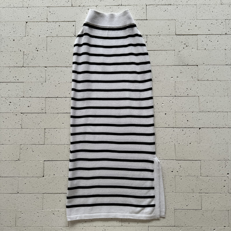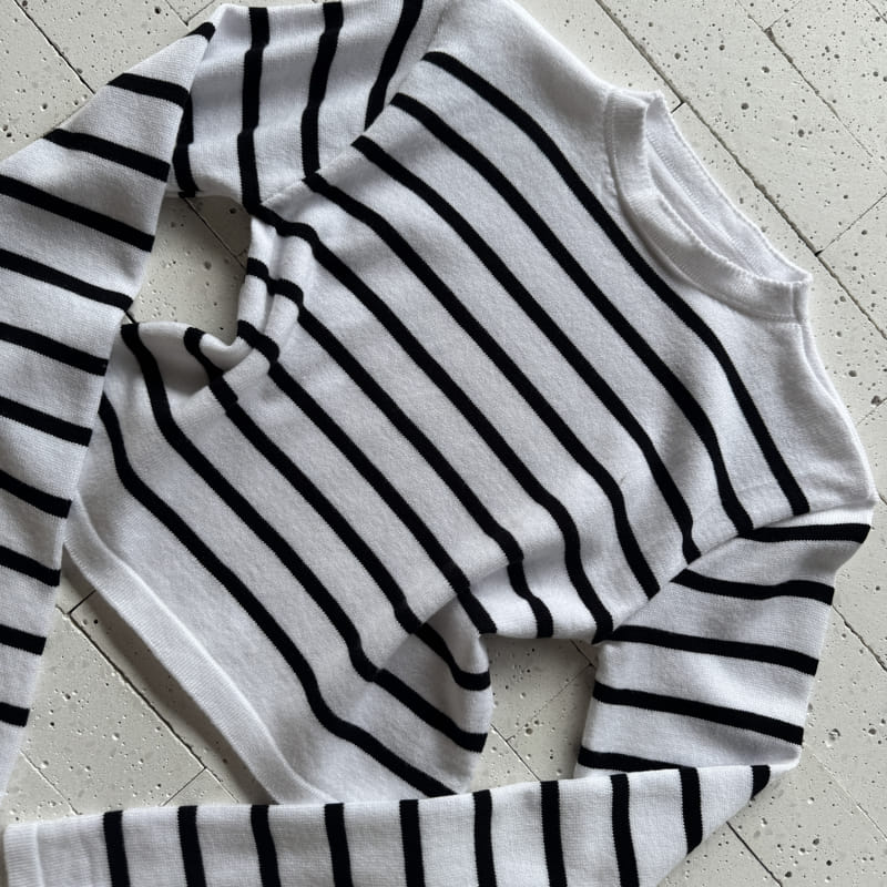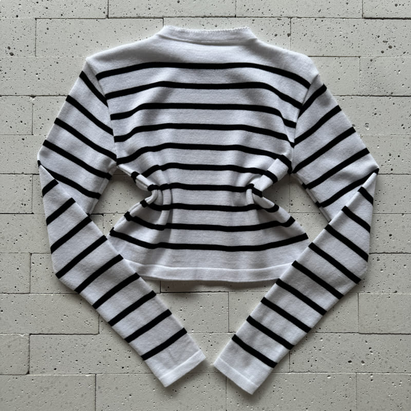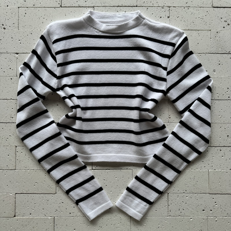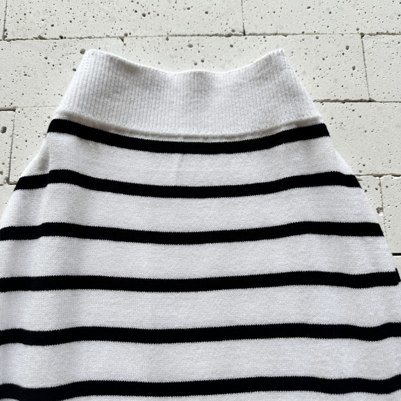 CONJUNTO MODAL LISTRADO CROPPED MANGA LONGA E SAIA MIDI OFF – Elegância Atemporal em Tricô Listrado