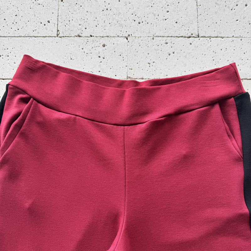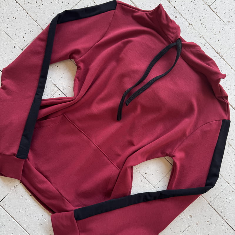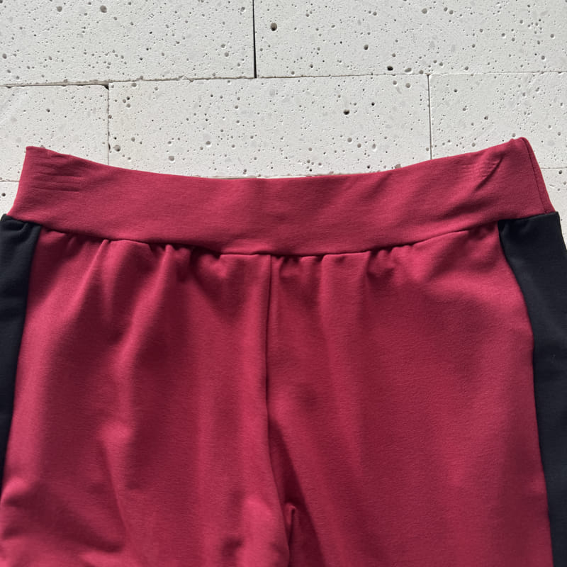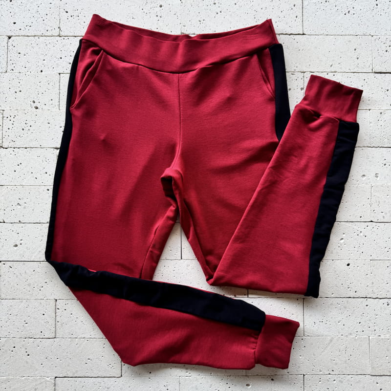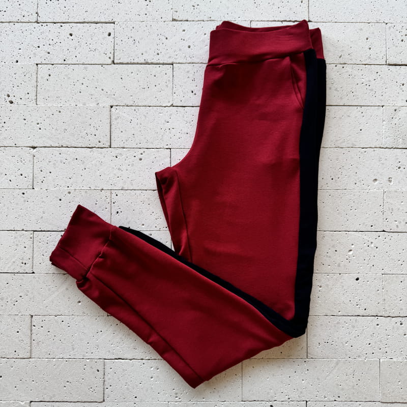 - Cor: Marsala com faixas pretas contrastantes nas mangas e laterais da calça