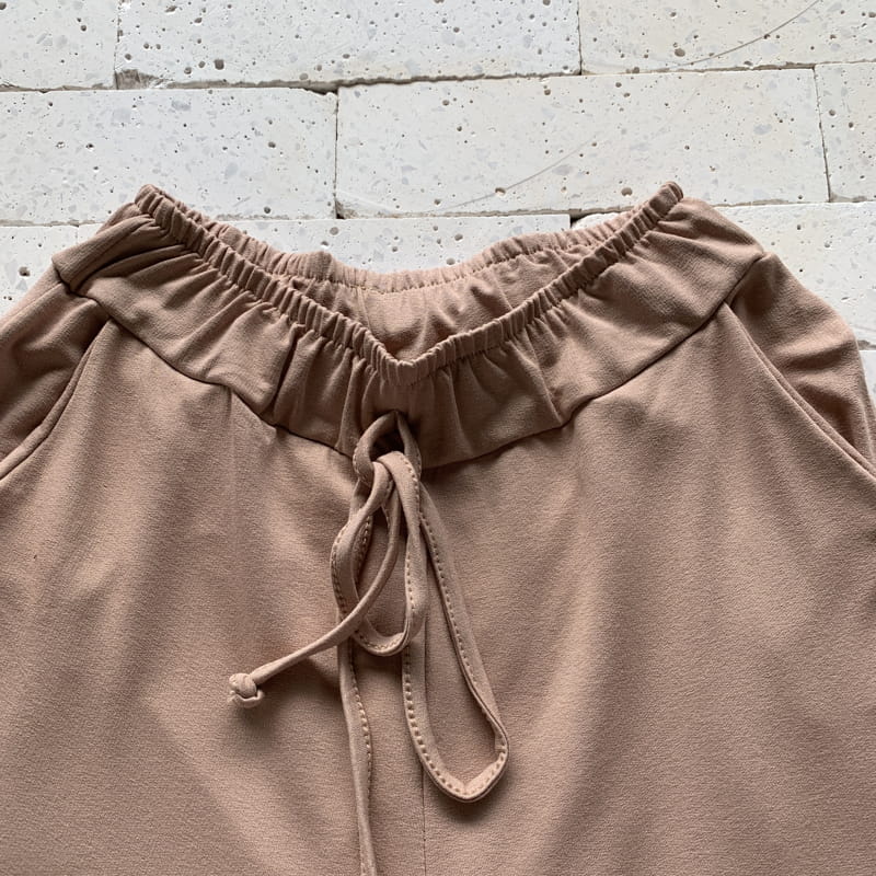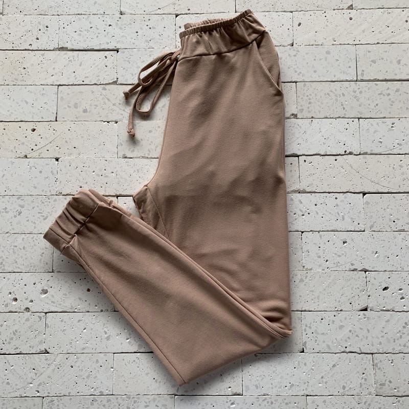 - Calça: ajustada ao corpo, cós e barra com elástico, bolsos