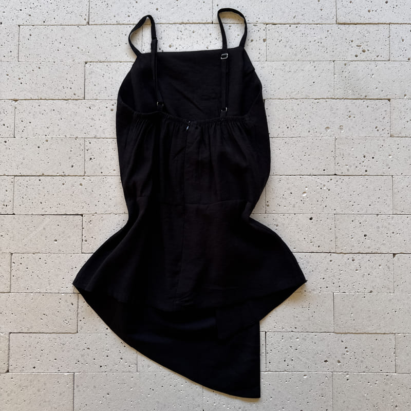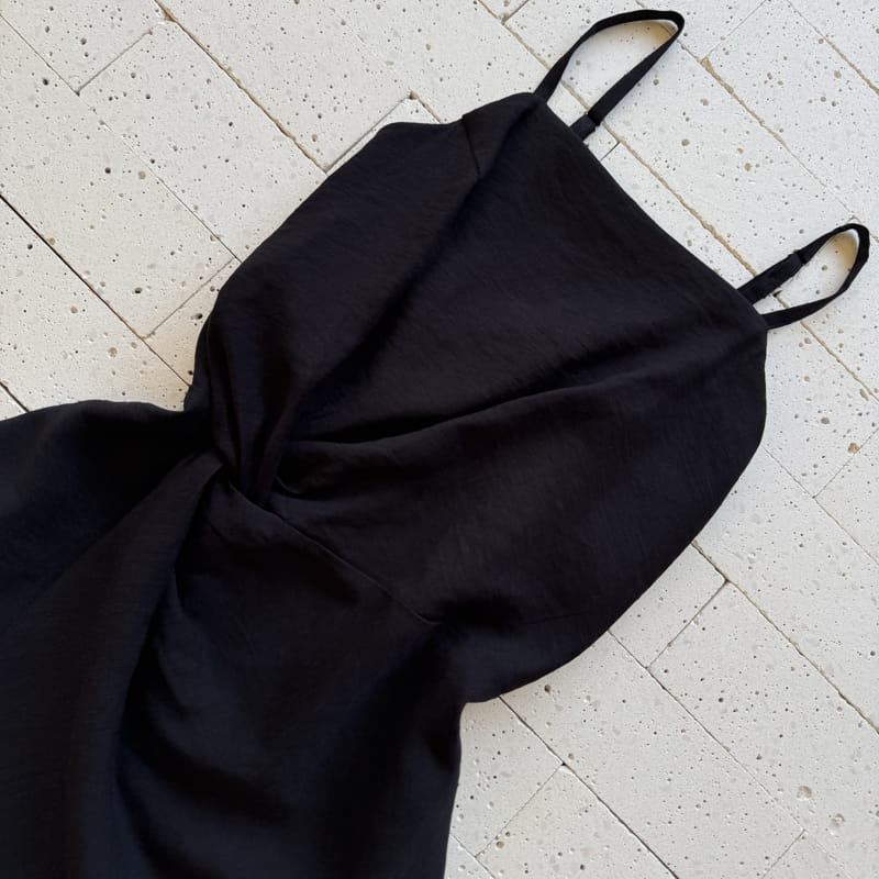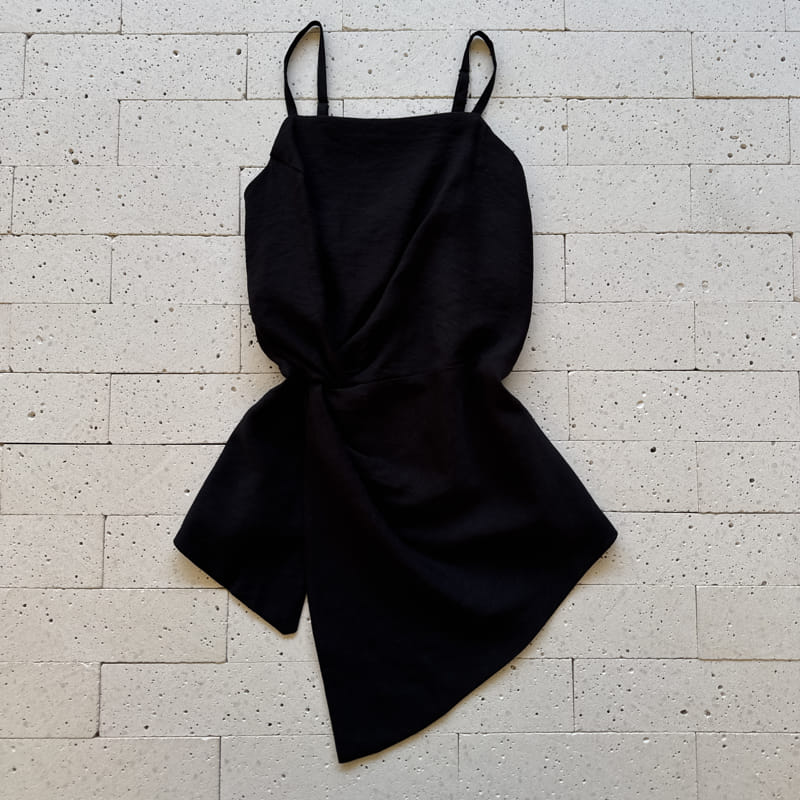 Este conjunto preto é a definição de sofisticação atemporal. Composto por uma regata assimétrica com detalhe de nó frontal e acabamento em bico, o modelo garante um caimento fluido e moderno. As alças finas com regulagem e o elástico nas costas proporcionam ajuste confortável ao corpo. O short acompanha o visual com cós alto, botões forrados, bolsos laterais funcionais e passantes delicados. Ideal para quem busca um look versátil, elegante e com toque de alfaiataria leve para os dias mais quentes.