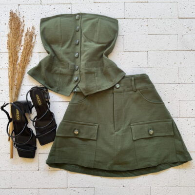 CONJUNTO TOMARA QUE CAIA E SHORT SAIA BOTÕES PEROLADO VERDE OLIVA – Elegância e Modernidade