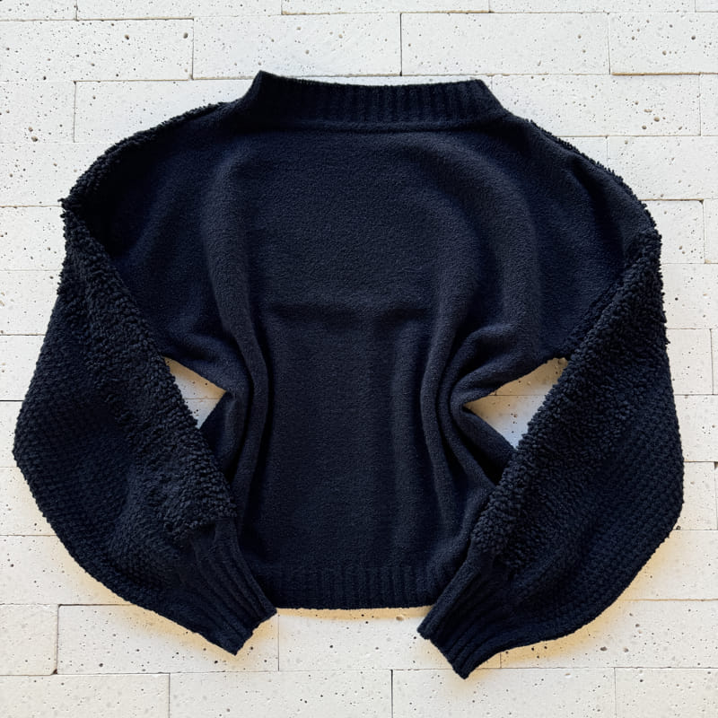 - Blusa com mix de pontos: trama trançada, detalhe canelado na gola e punhos, e textura tipo “pelúcia” nos ombros e mangas