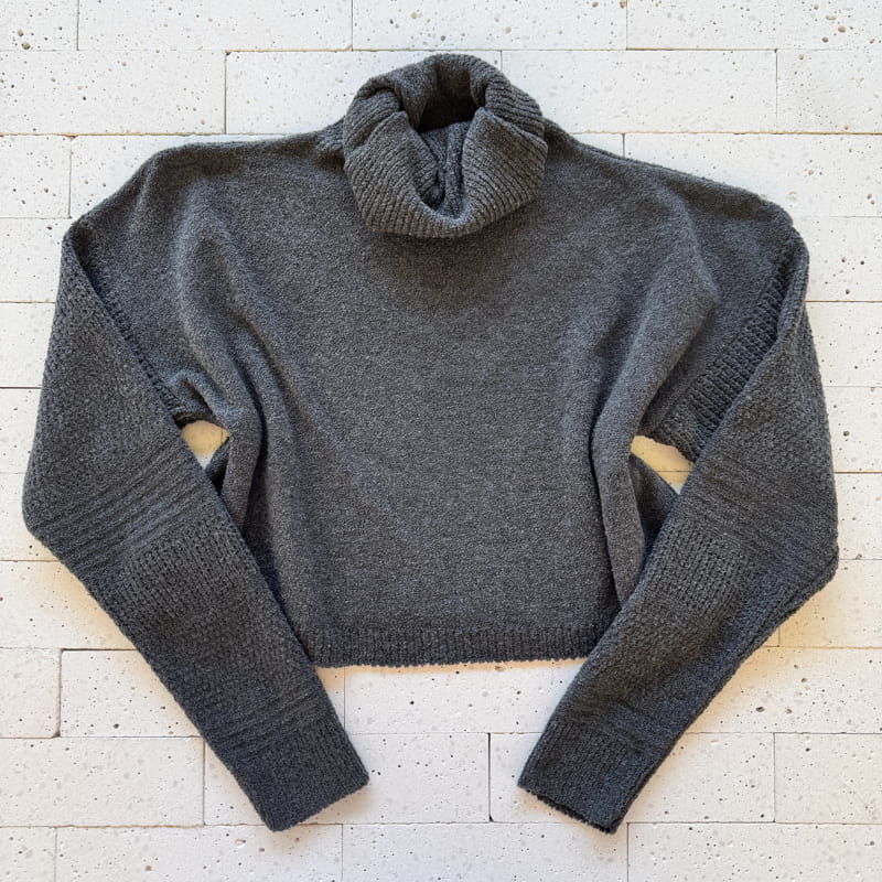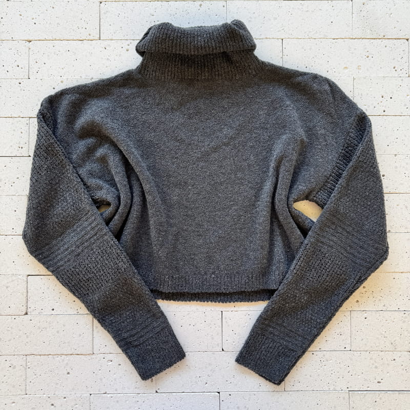 - Cropped com gola boba ampla e punhos canelados.