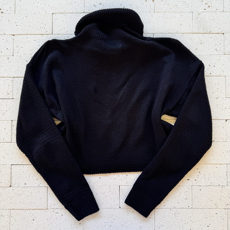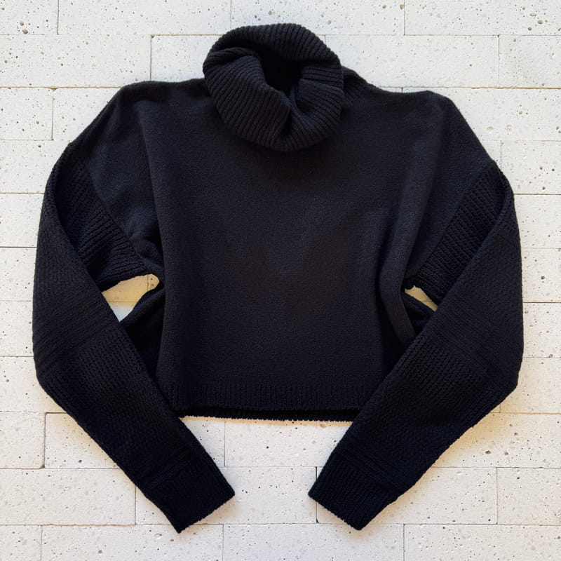 - Blusa: cropped com gola boba, barra reta e punhos em trama canelada.