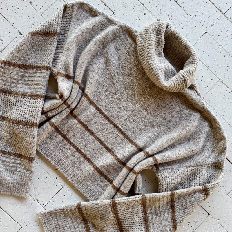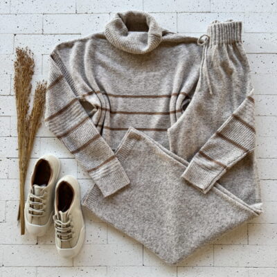 CONJUNTO TRICÔ MOUSSE CROPPED LISTRA E CALÇA PANTALONA BEGE – Sofisticação e aconchego para os dias frios
