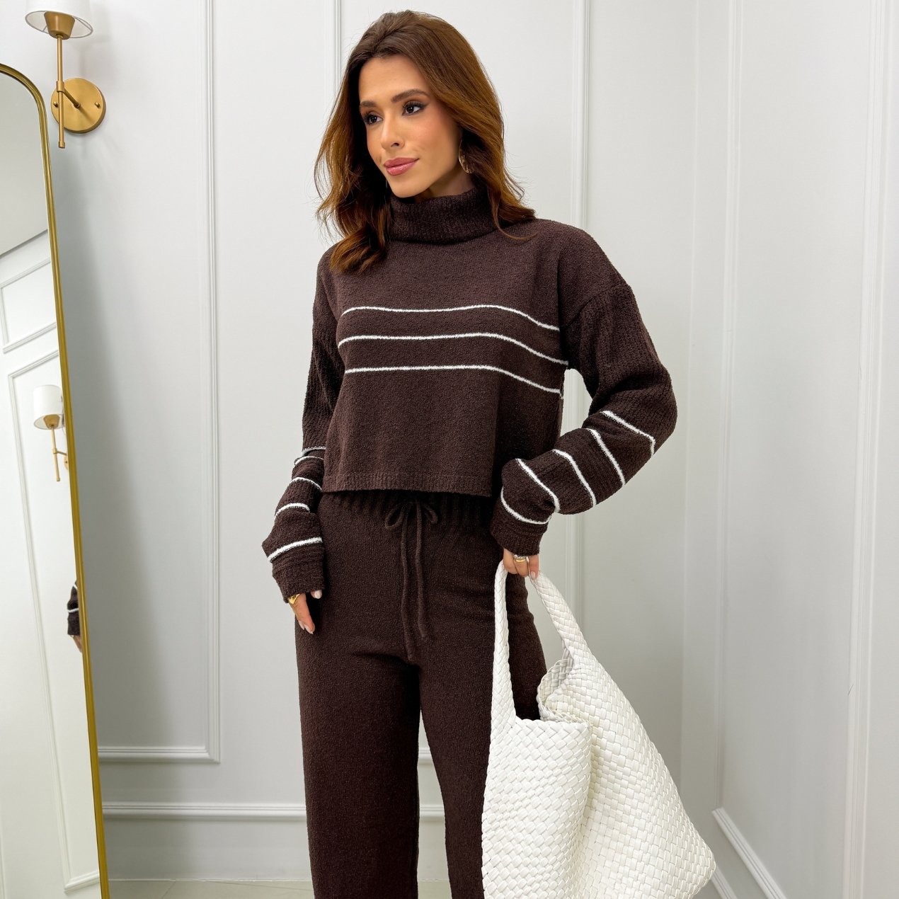 Como Usar o Conjunto Tricô Mousse Cropped Listra e Calça Pantalona Café