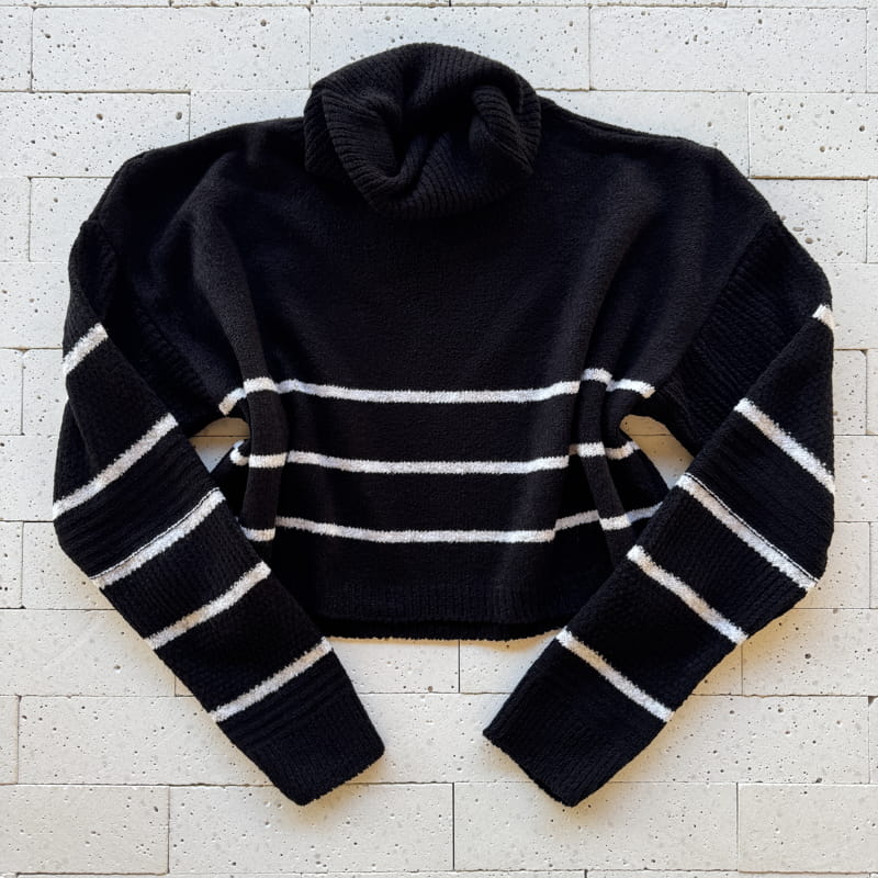 - Cor: preto com listras brancas contrastantes no cropped e mangas