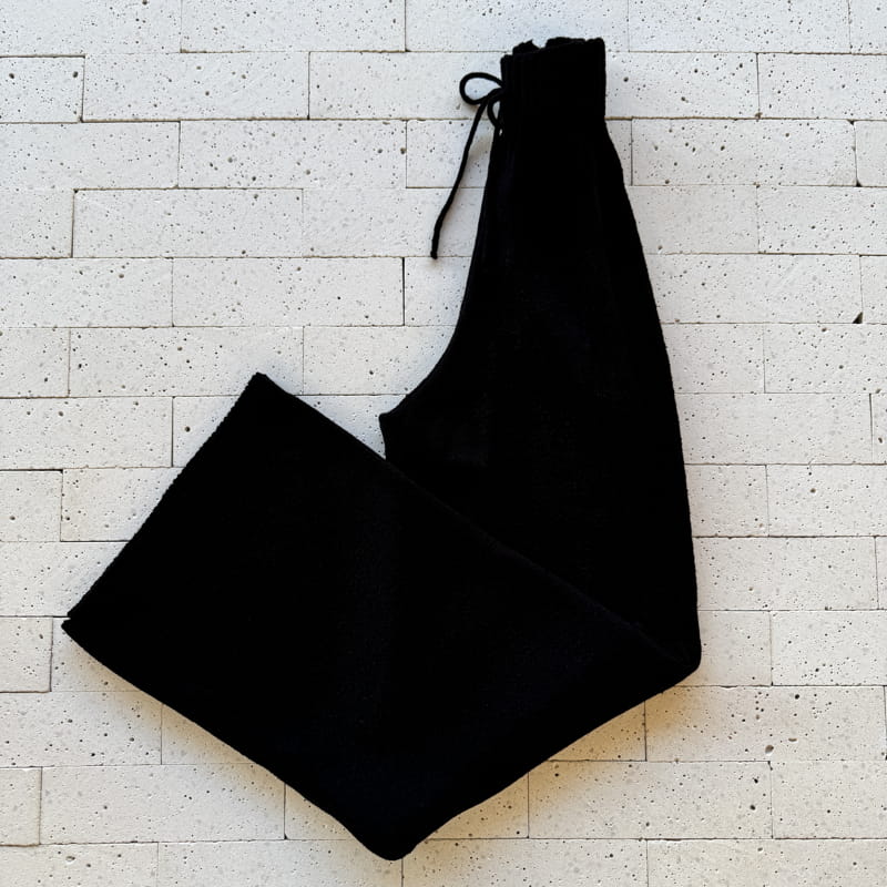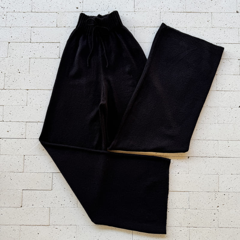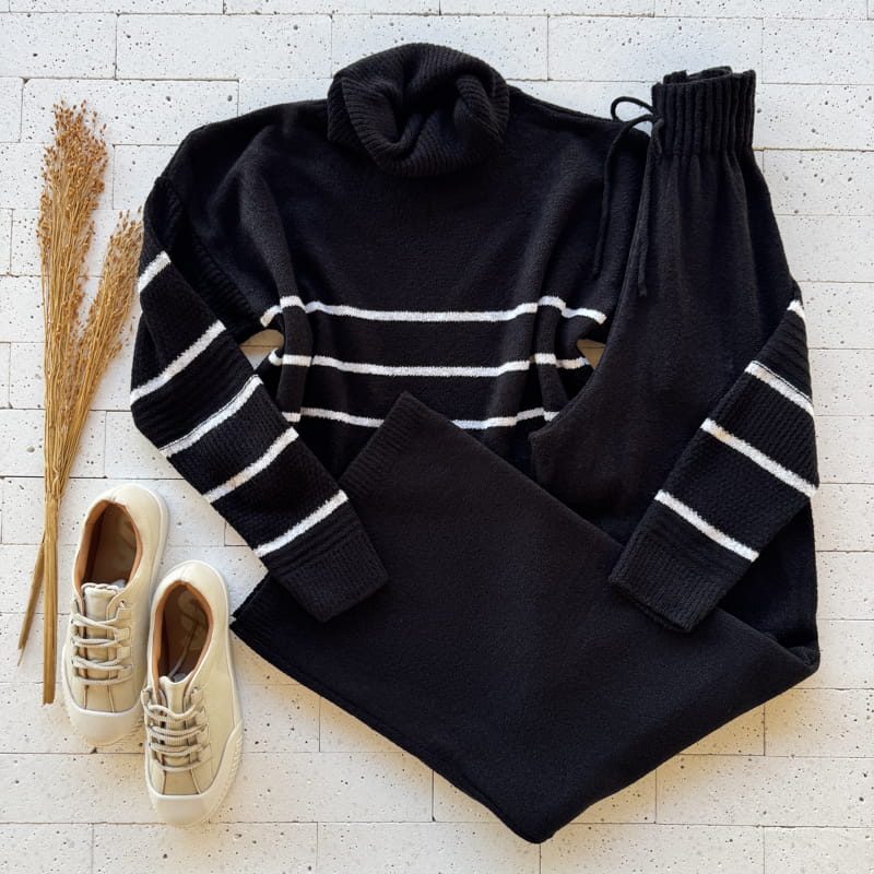CONJUNTO TRICÔ MOUSSE CROPPED LISTRA E CALÇA PANTALONA PRETO – Sofisticação atemporal com toque aconchegante