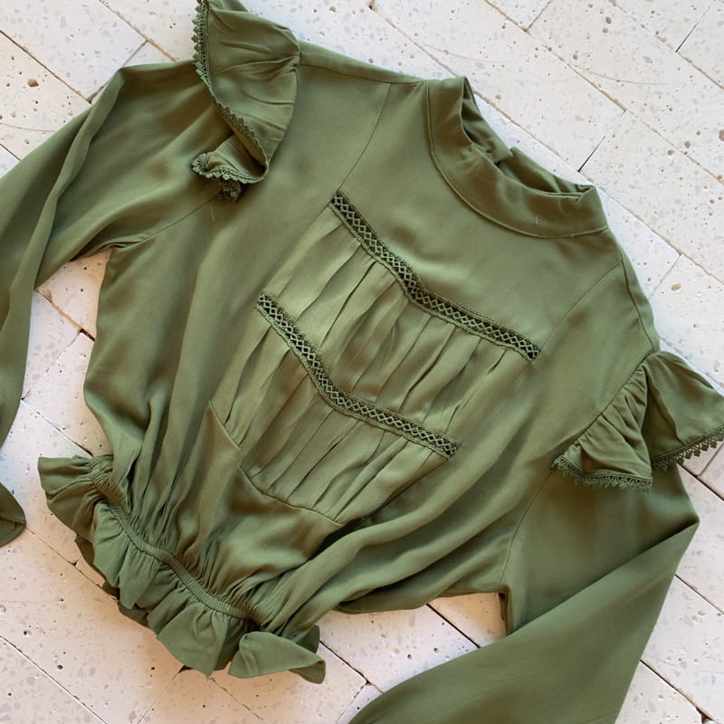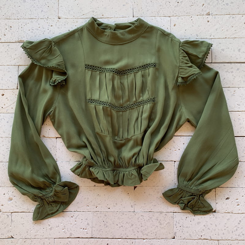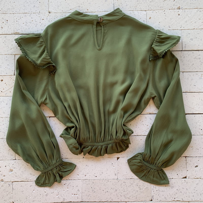 Escolha seu Cropped Babados Detalhe em Gripier Luxo Verde Militar com nosso PROVADOR VIRTUAL