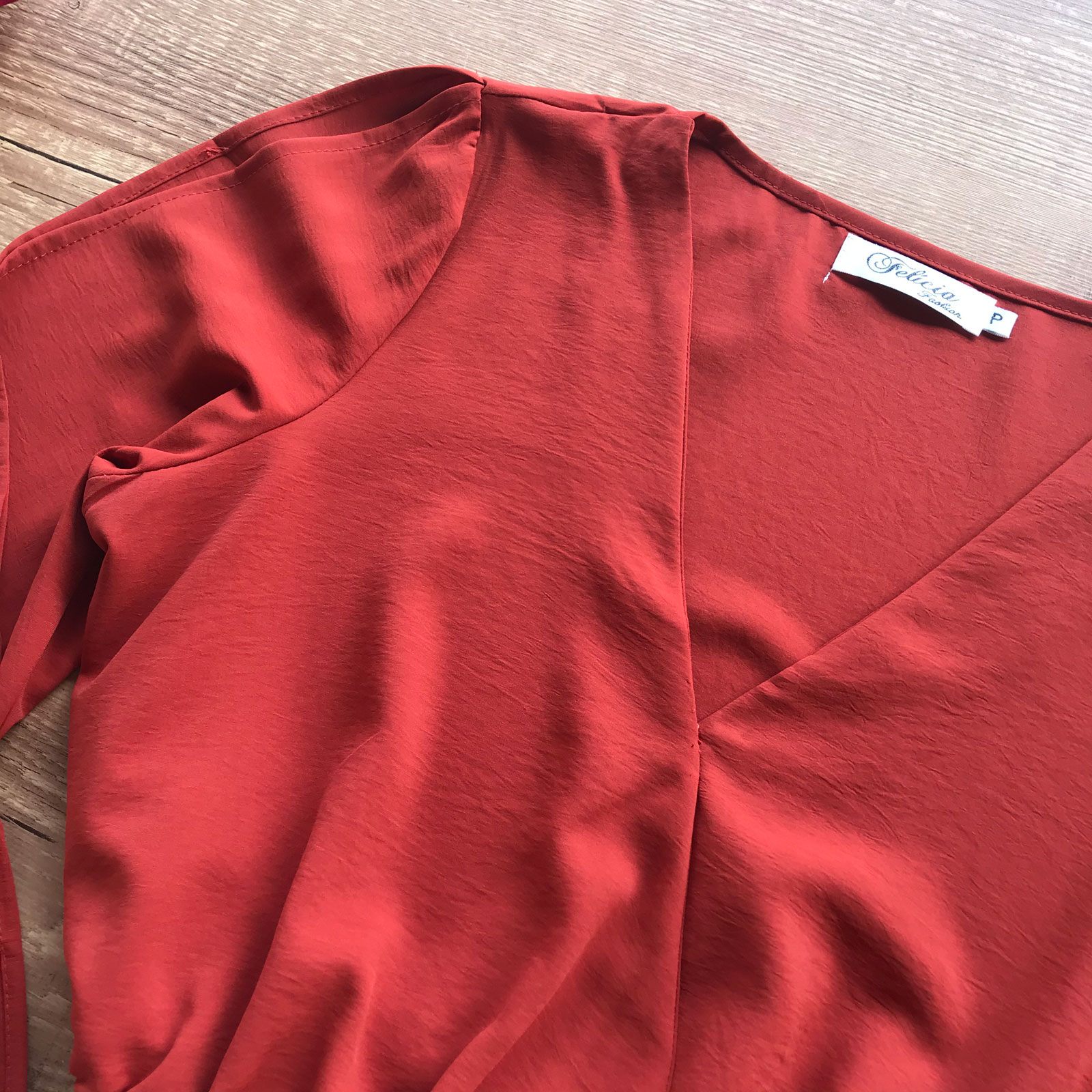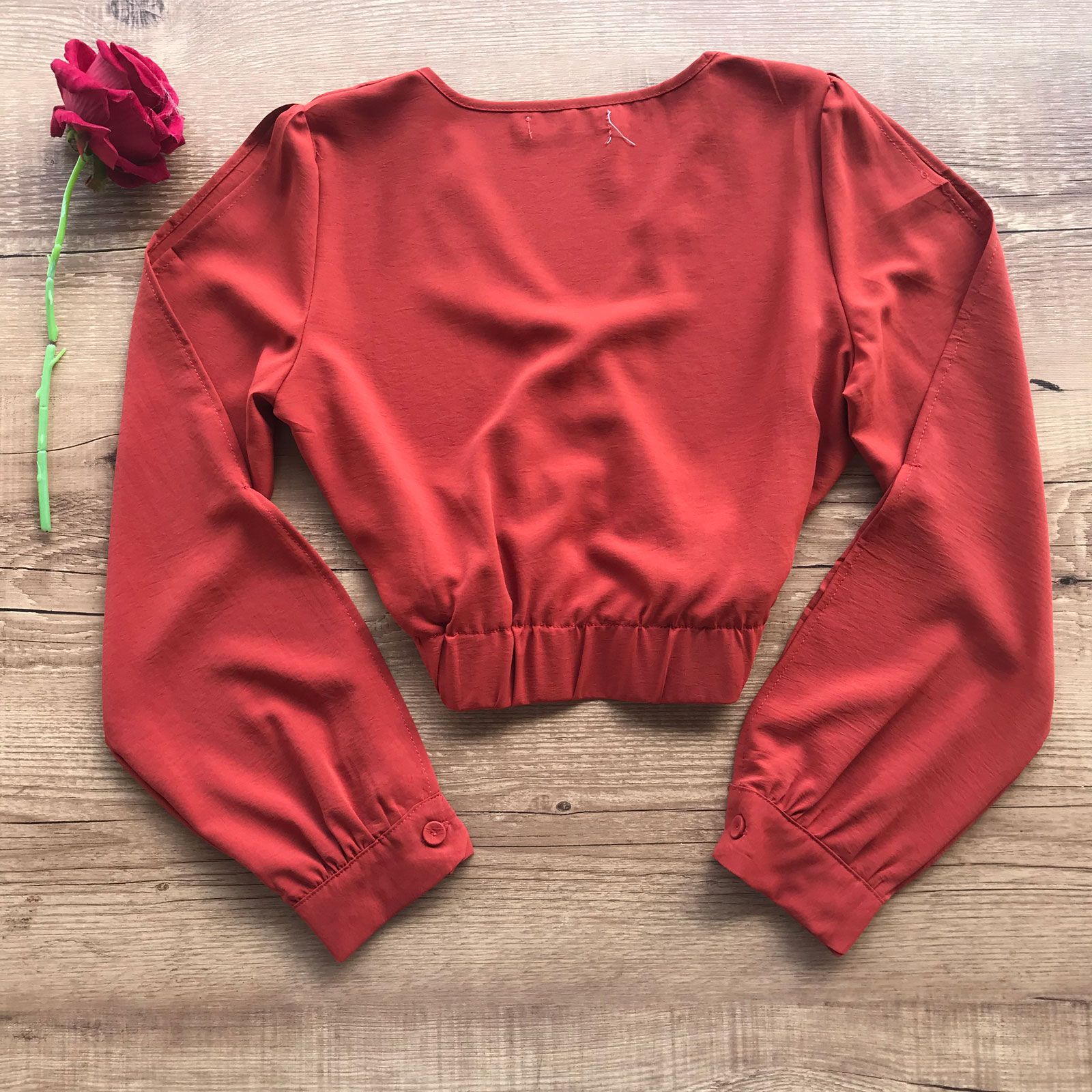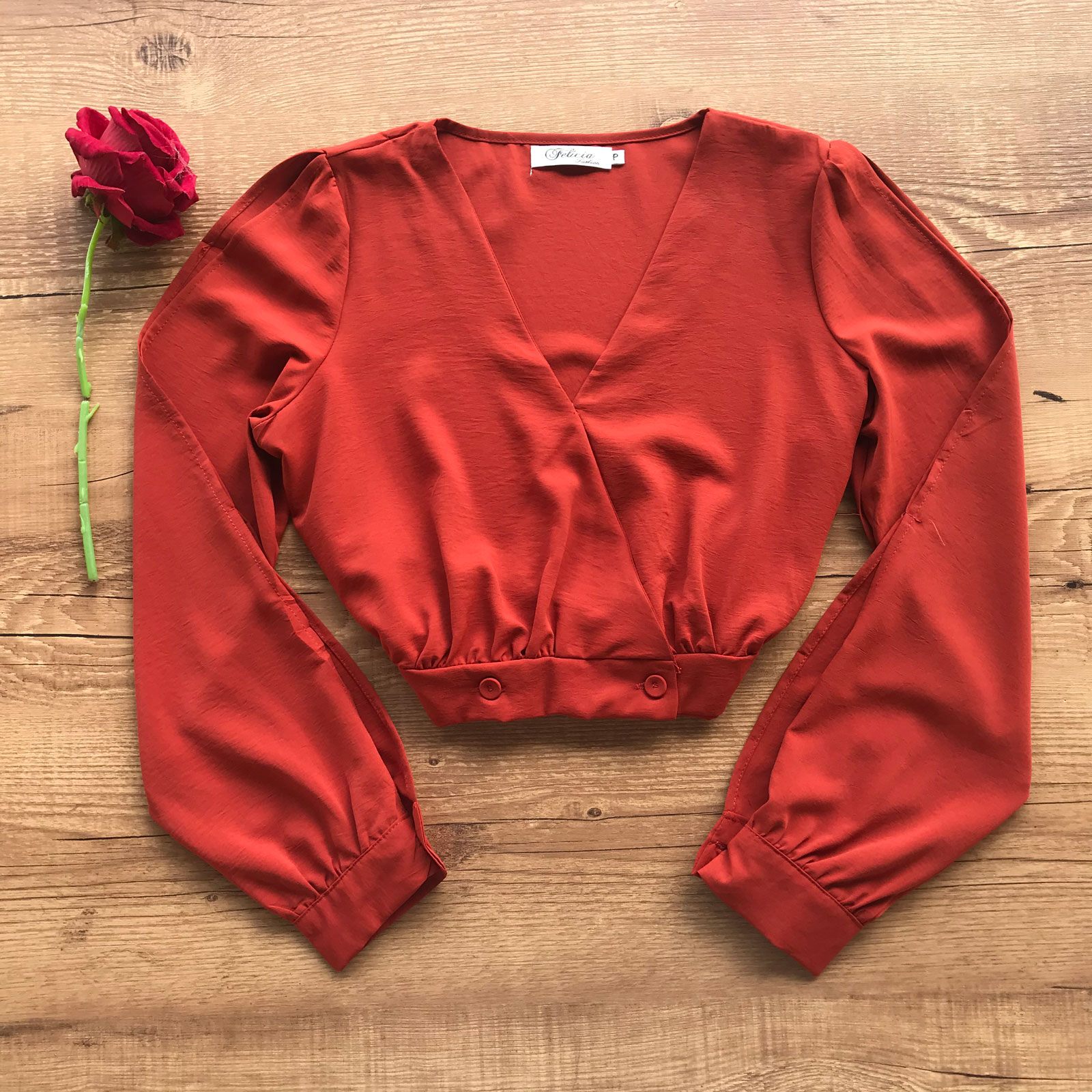 - Decote em formato V transpassado;